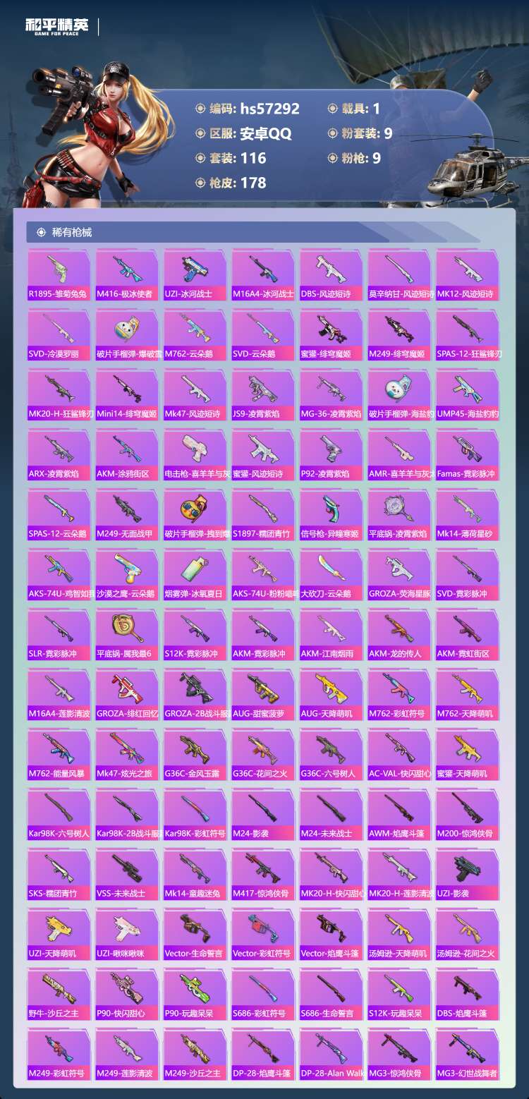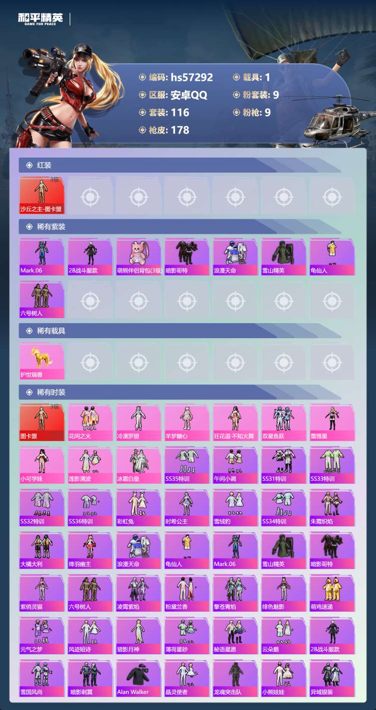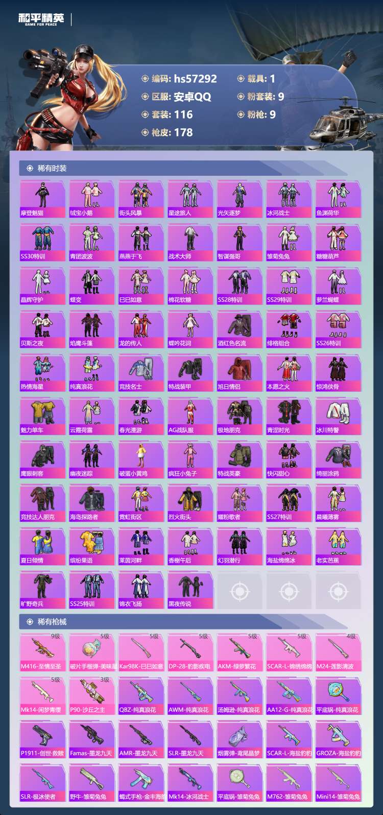 hs57292 安卓手Q-12王牌印记-1红装-9粉装-9特效枪-1载具-64848热力值-116套