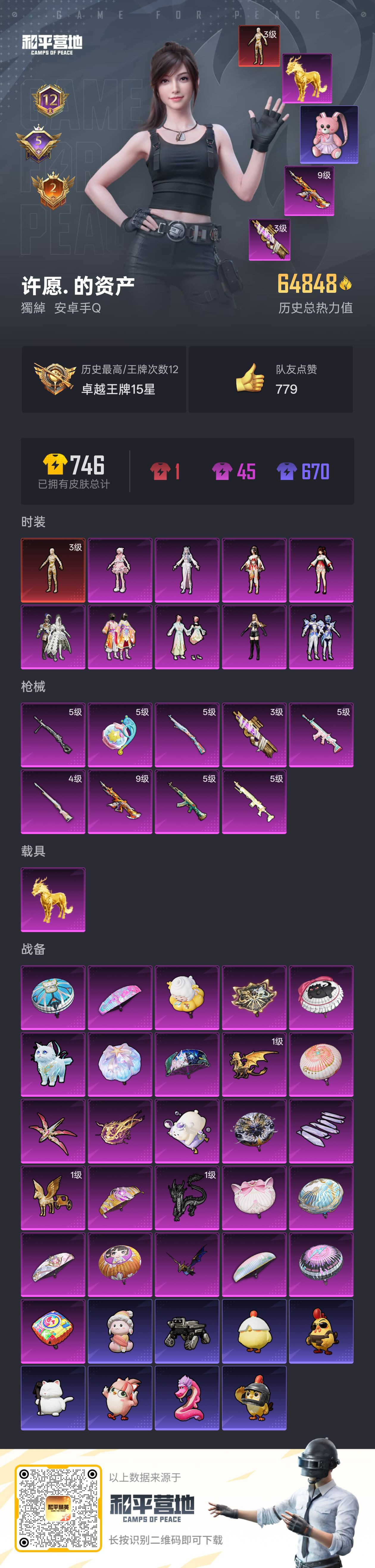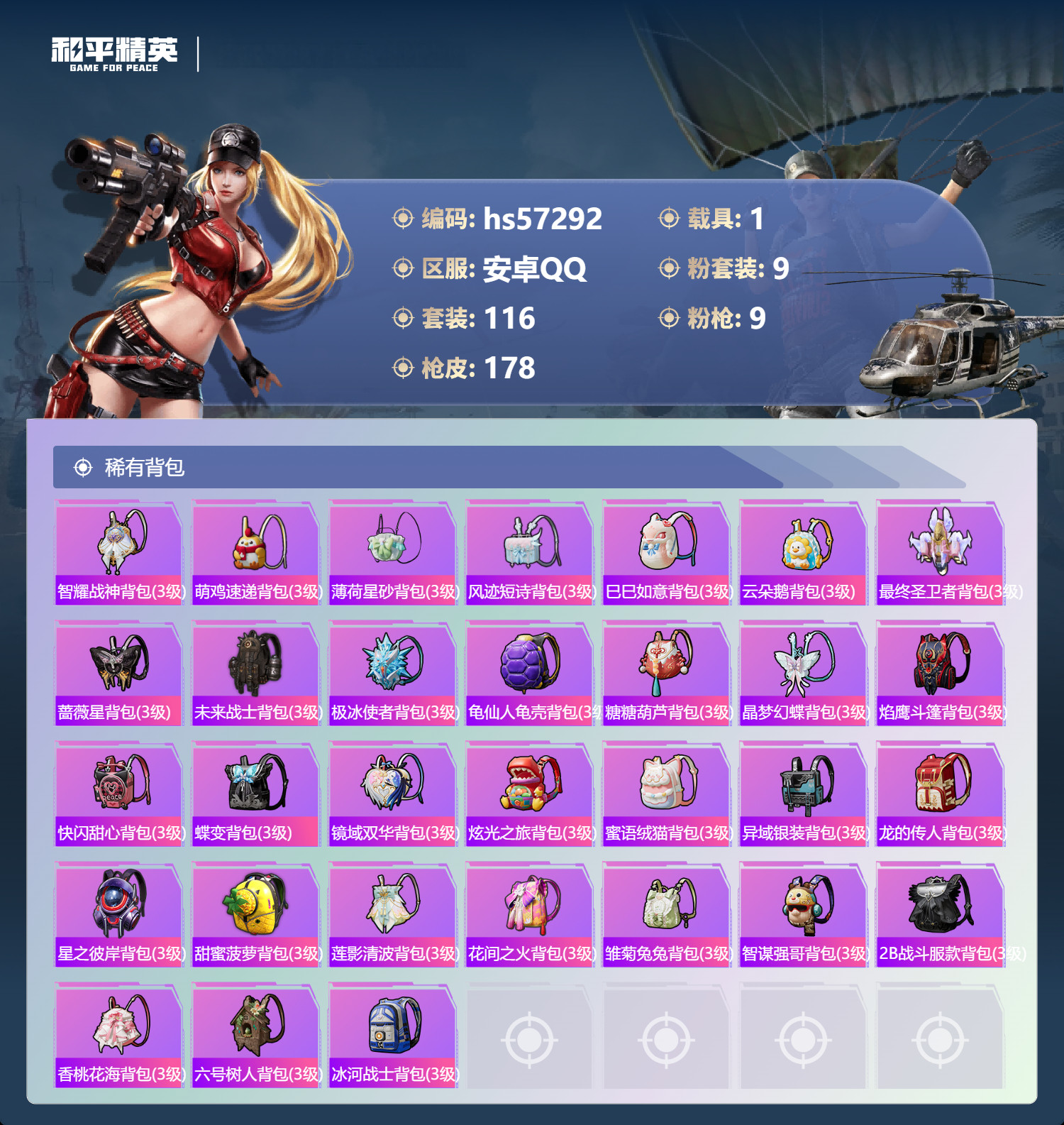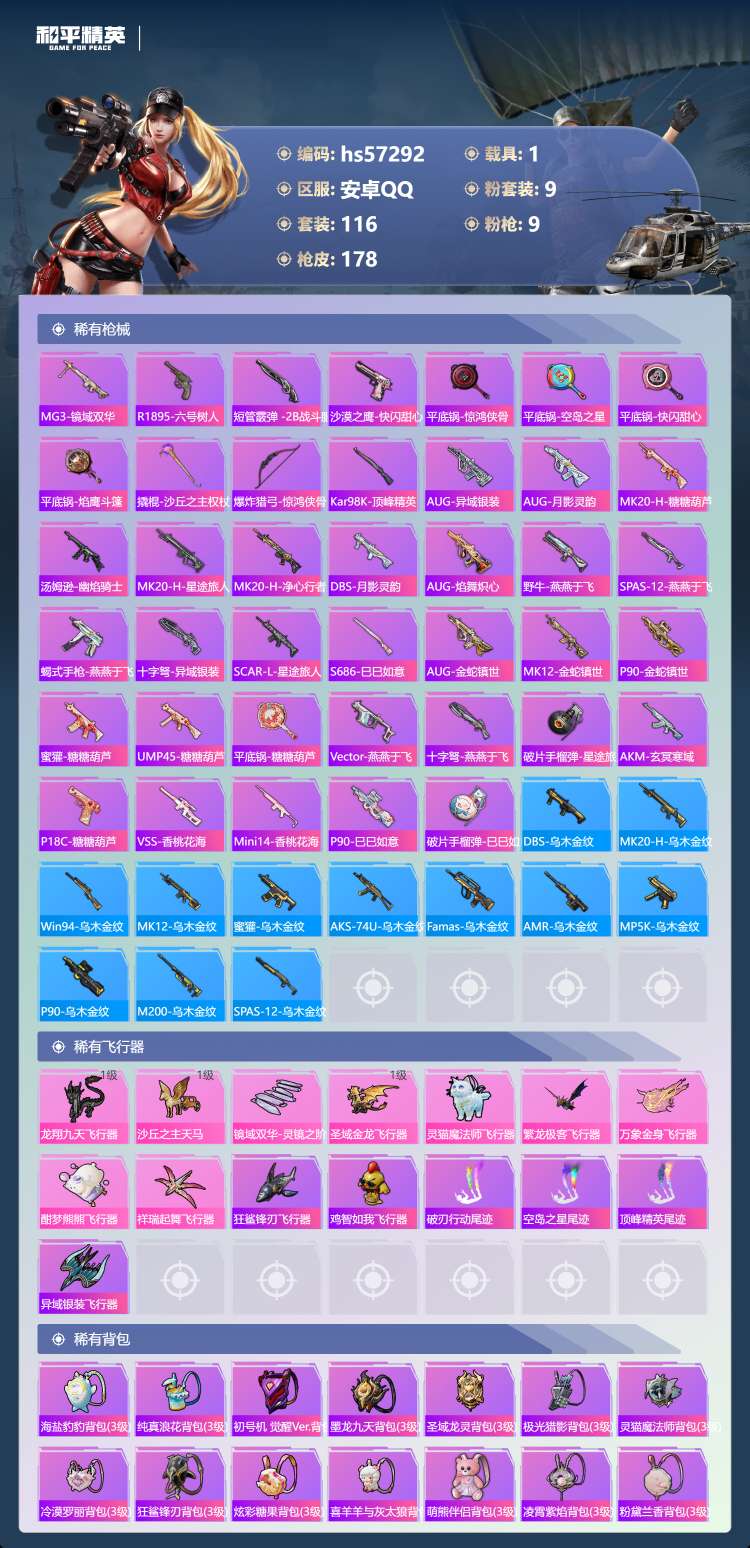 hs57292 安卓手Q-12王牌印记-1红装-9粉装-9特效枪-1载具-64848热力值-116套