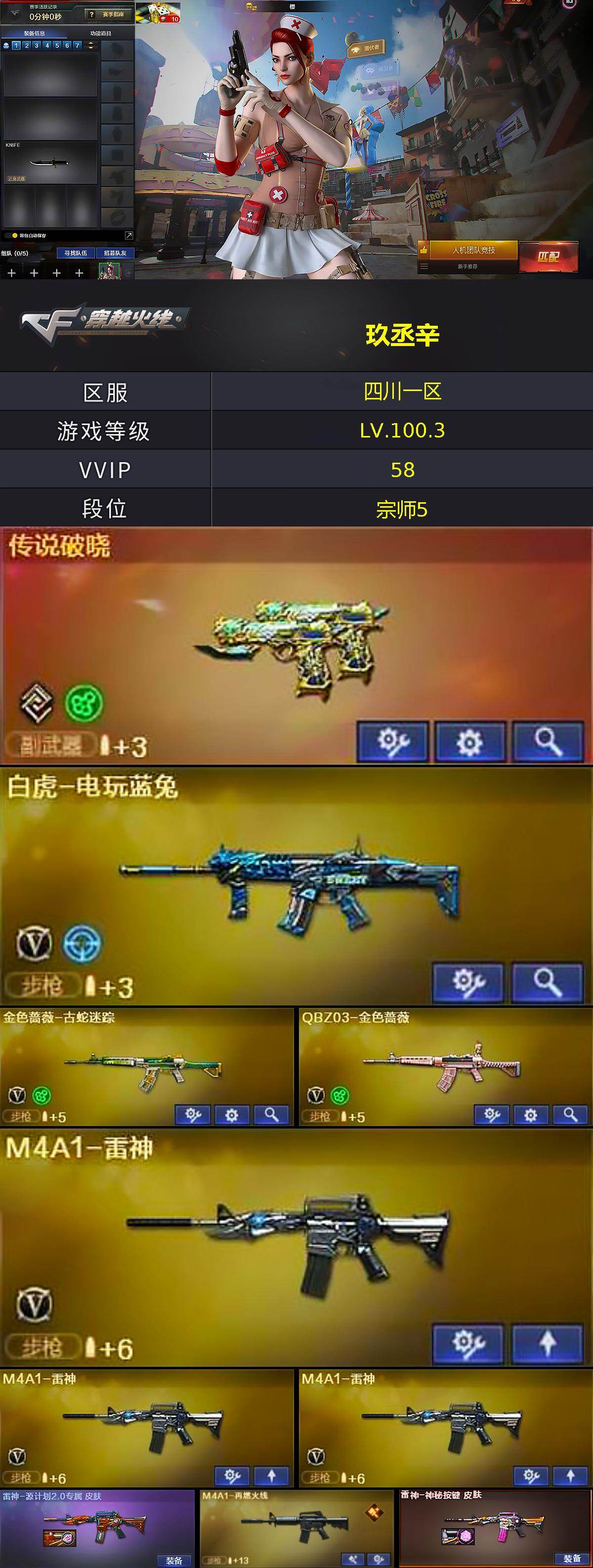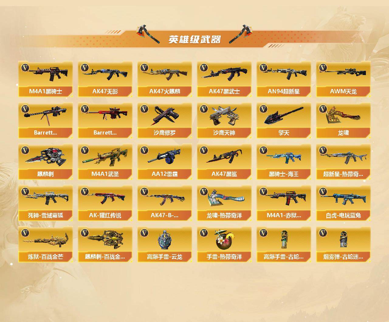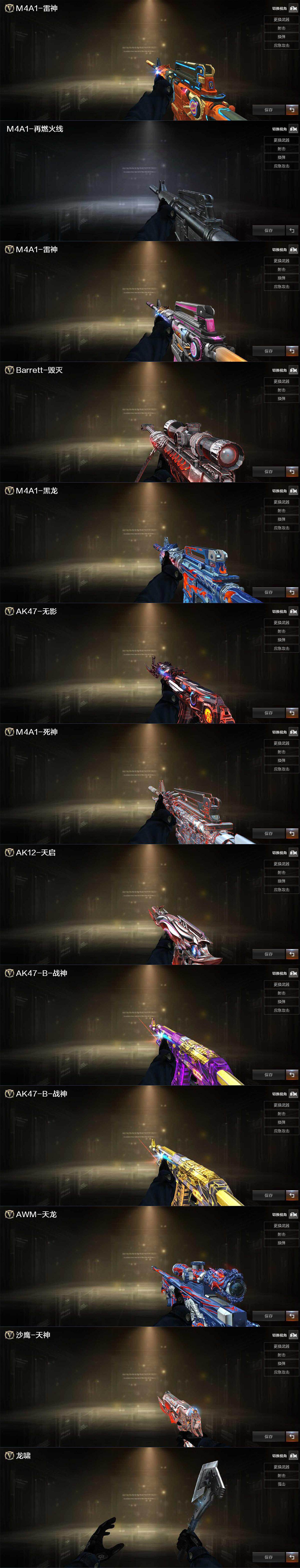 【热门武器】:传说破晓,QBZ03-金色蔷薇,金色蔷薇-古蛇迷踪,修罗-古蛇迷踪,白虎-电玩蓝兔,M4A1-黑骑士,沙鹰-修罗*3