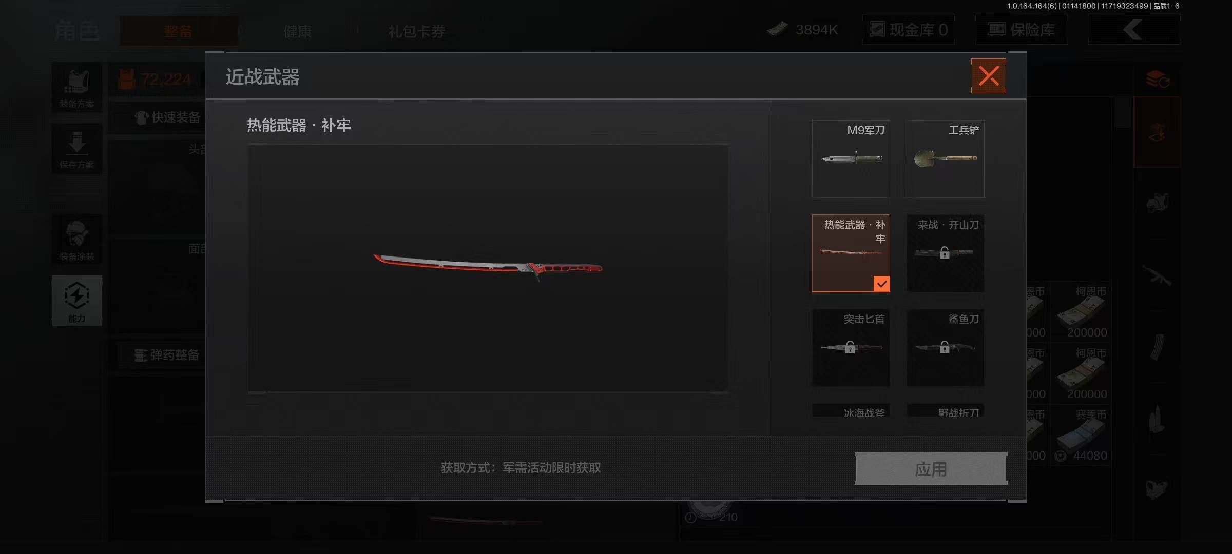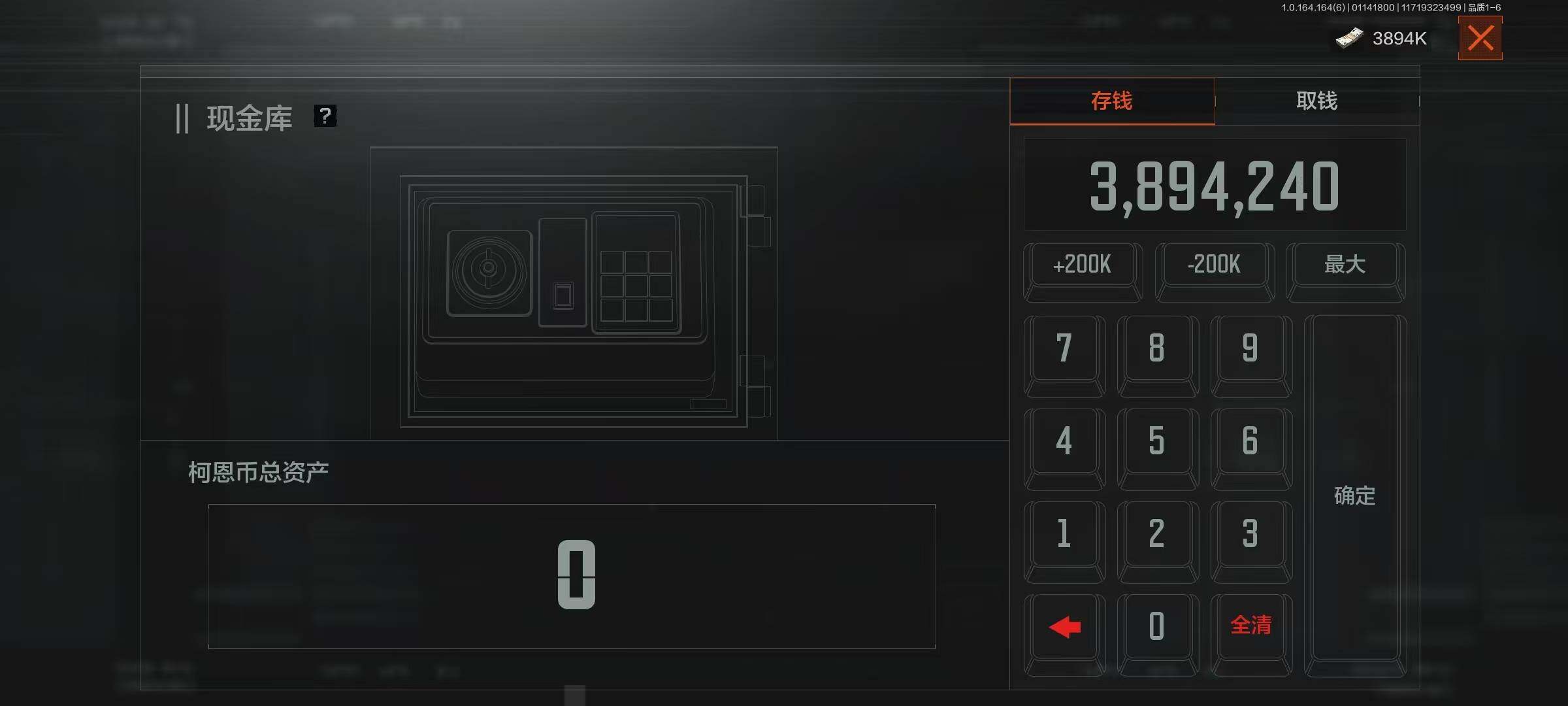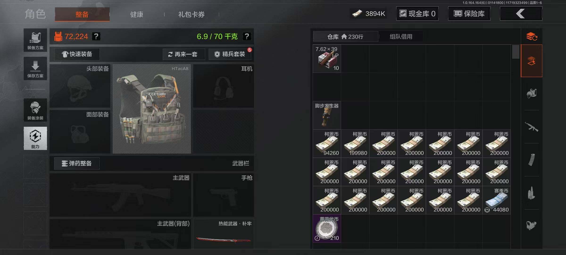 仓库价值(百万):3.9/柯恩币:3894240/热能武器补牢/工兵铲