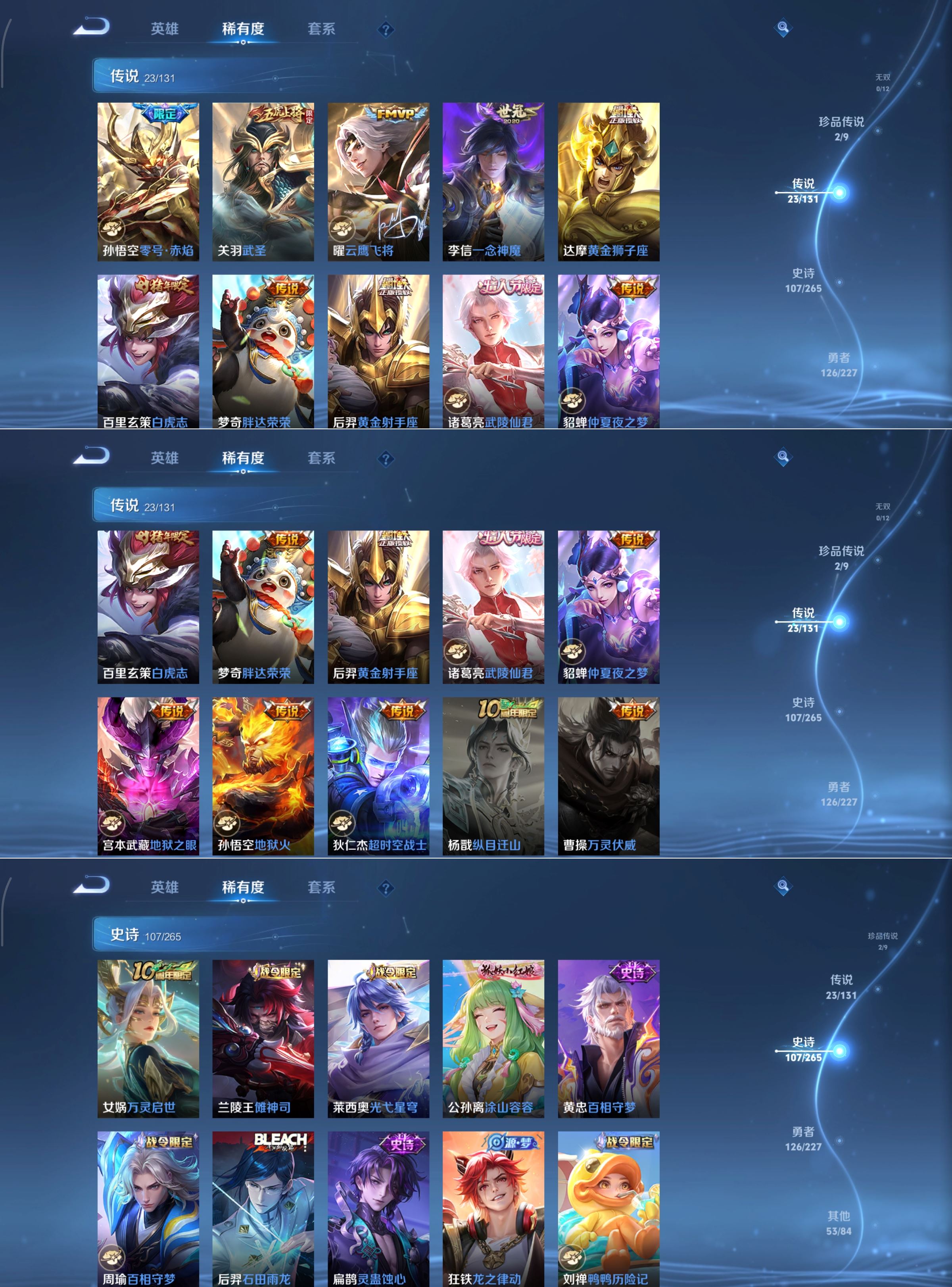 【传说皮肤】 神树通天 鹤羽星尊 鸣野蒿 九山相柳 山海·苍雷引 挚爱之约 白虎志 黄金狮子座 超时空战士 仲夏夜之梦 地狱之眼 武圣 黄金射手座 绛天战甲 一念神魔 胖达荣荣 地狱火 零号·赤焰 云鹰飞将 李逍遥 启明星使 武陵仙君 时雨天司