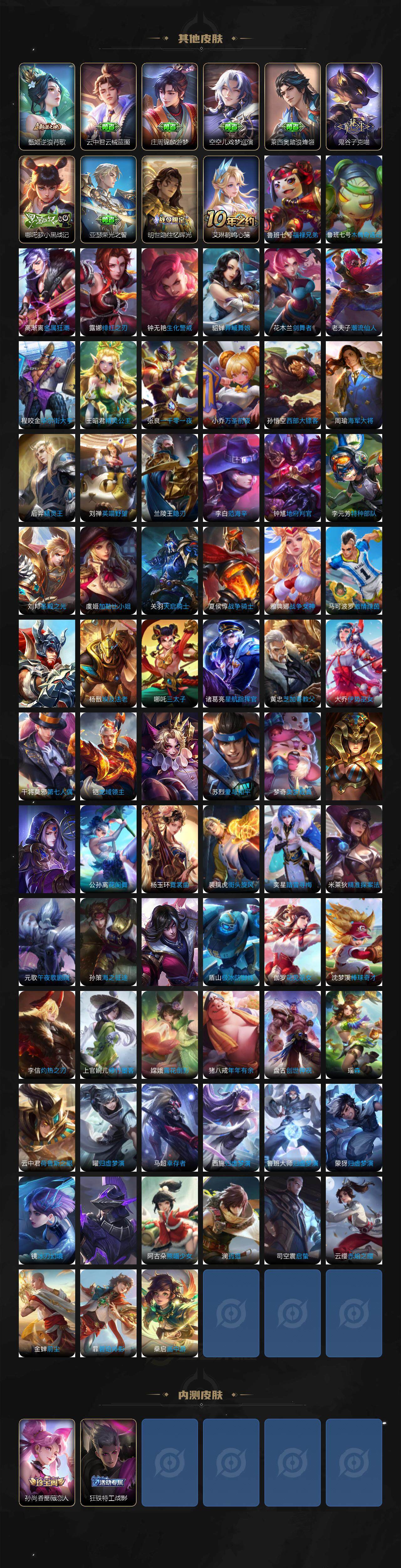 【史诗皮肤】 蔬乡物语 蔬乡物语 破空之剑 茶境仙 百相守梦 布丁狗之约 谧流熔炉 孙行者 鸭鸭历险记 龙之律动 地狱燃心 谪仙醉月 熊喵少女 威尼斯狂欢 罗小黑战记 山海·玄木吟 青焰无