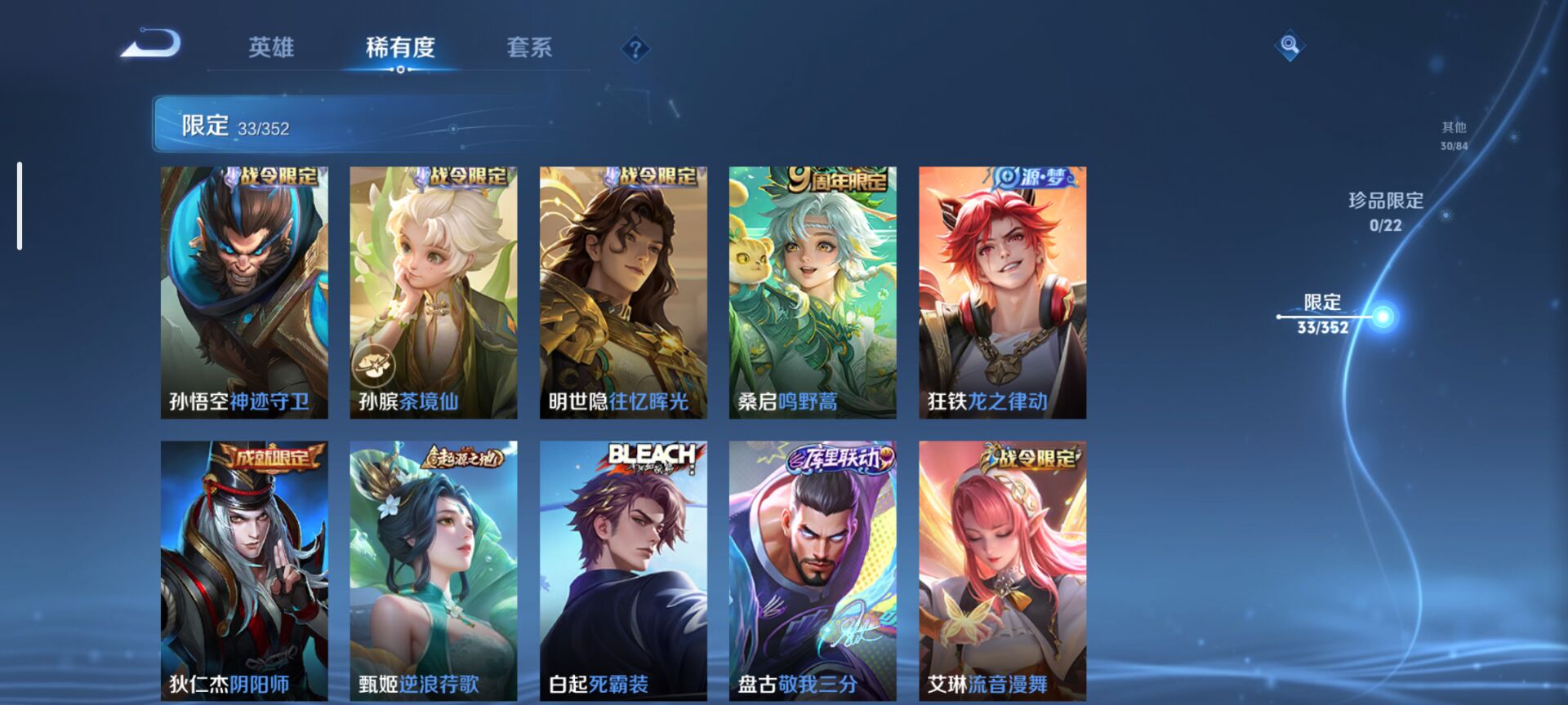 【史诗皮肤】 破空之剑 茶境仙 布丁狗之约 谧流熔炉 龙之律动 地狱燃心 线条小狗 威尼斯狂欢 罗小黑战记 青焰无极 夏日便利店 苍威无极 光弋星穹 万灵启世 魅力维加斯 鹰眼统帅 箭羽风息 鬼剑武藏 曙光守护者 紫霞仙子 末日机甲 月团寄思 水果甜心 时之恋人 青蛇 冰冠公主 摇滚巨星 暗夜贵公子 皇家上将 星夜王子 特工魅影