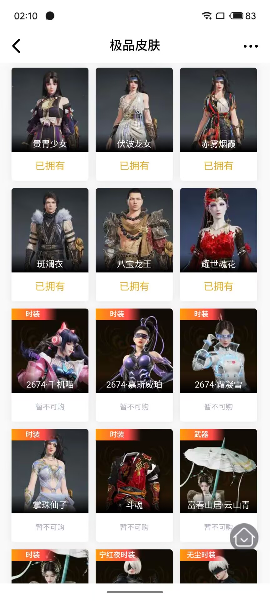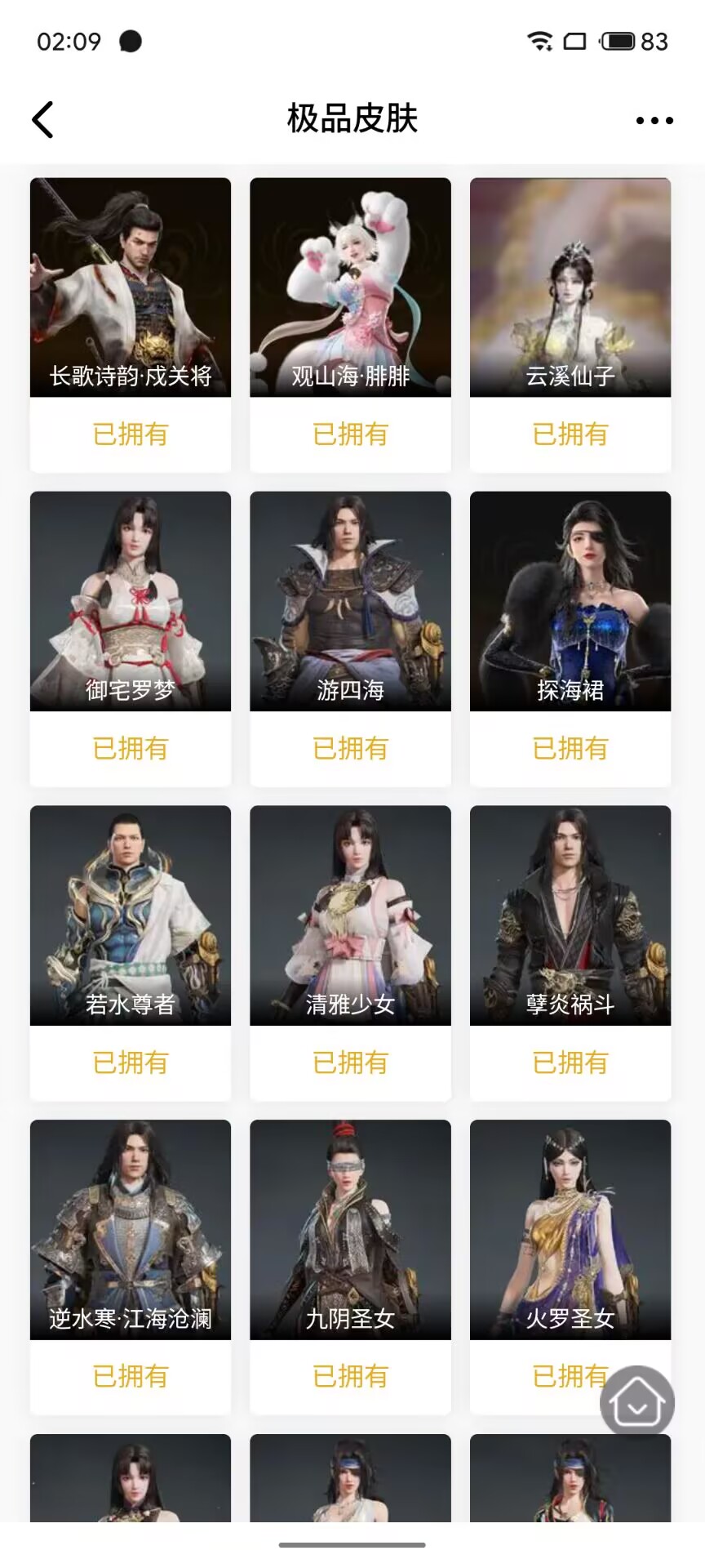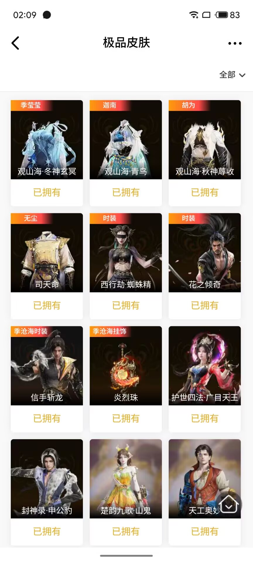 【极品皮肤】 护世四法·广目天王 封神录·申公豹 楚韵九歌·山鬼 天工奥妙 观山海·秋神蓐收 观山海·青鸟 司天命 观山海·冬神玄冥 长歌诗韵·戍关将 观山海·腓腓 云溪仙子 探海裙 耀世魂花 孽炎祸斗 八宝龙王 斑斓衣 伏波龙女 九阴圣女 贵胄少女 御宅罗梦 游四海 若水尊者 火罗圣女 逆水寒·江海沧澜 清雅少女 赤雾烟霞 炎烈珠 西行劫·