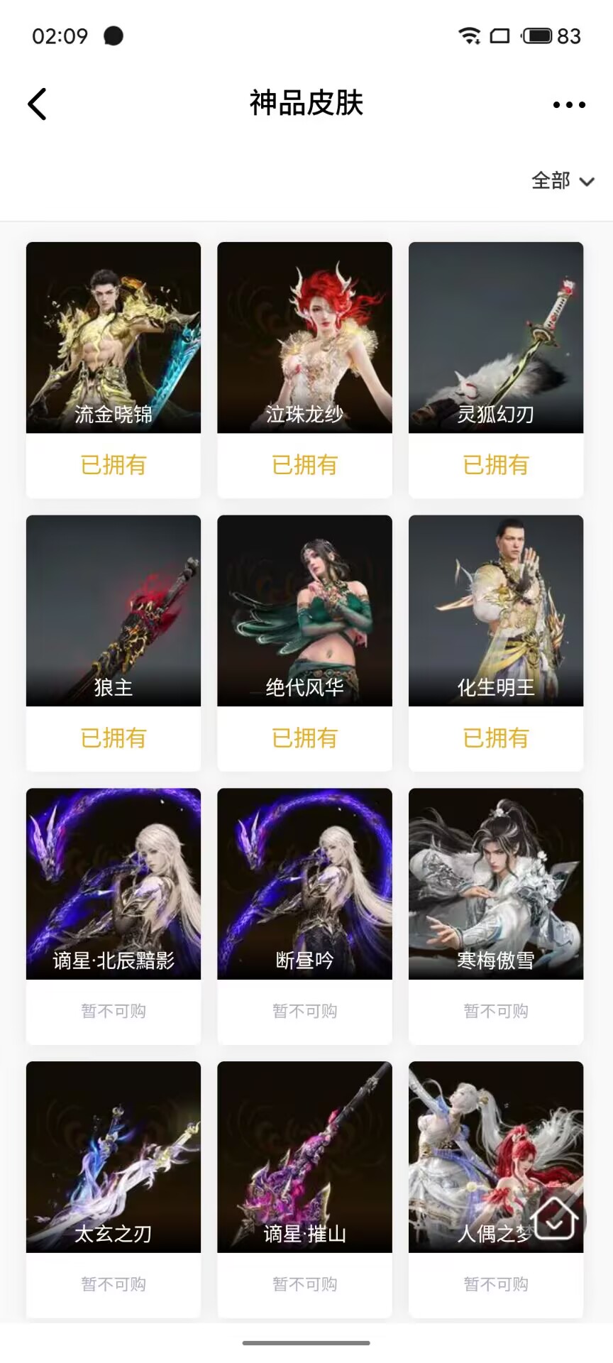 【神品皮肤】 流金晓锦 泣珠龙纱 灵狐幻刃 狼主 绝代风华 化生明王