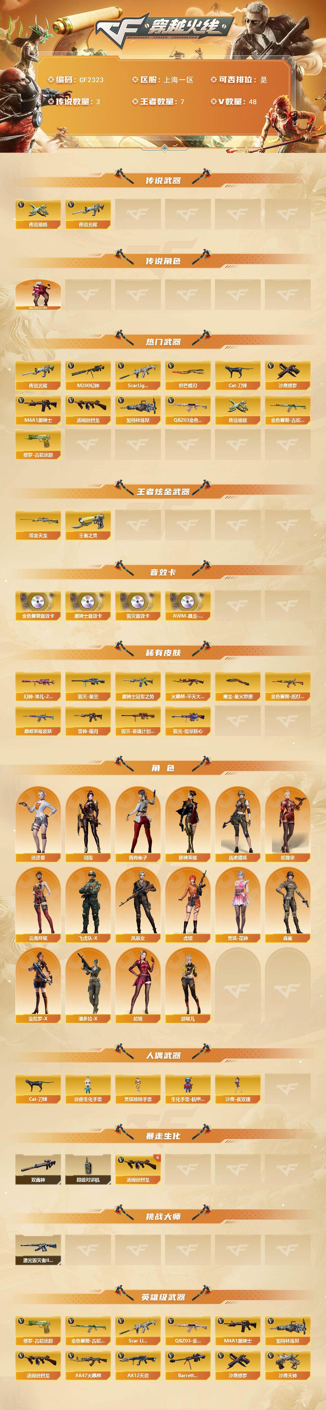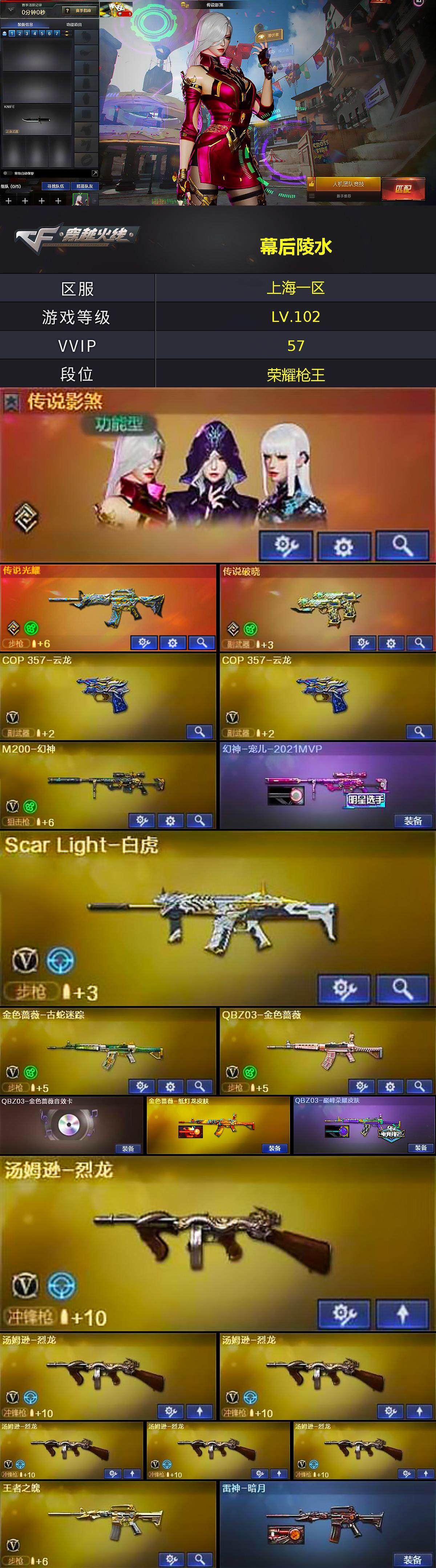 【CF2323】上海一区-48V-7王者-1炫金【双全号 传说光耀,传说破晓,QBZ03-金色蔷薇,Scar Light-白虎,M200-幻神,金色蔷薇-古蛇迷踪,修罗-古蛇迷踪,Cat-刀锋,M4A1-黑骑士,汤姆逊-烈龙*6,加特林-炼狱,沙鹰-修罗,炽芒蝶刃】