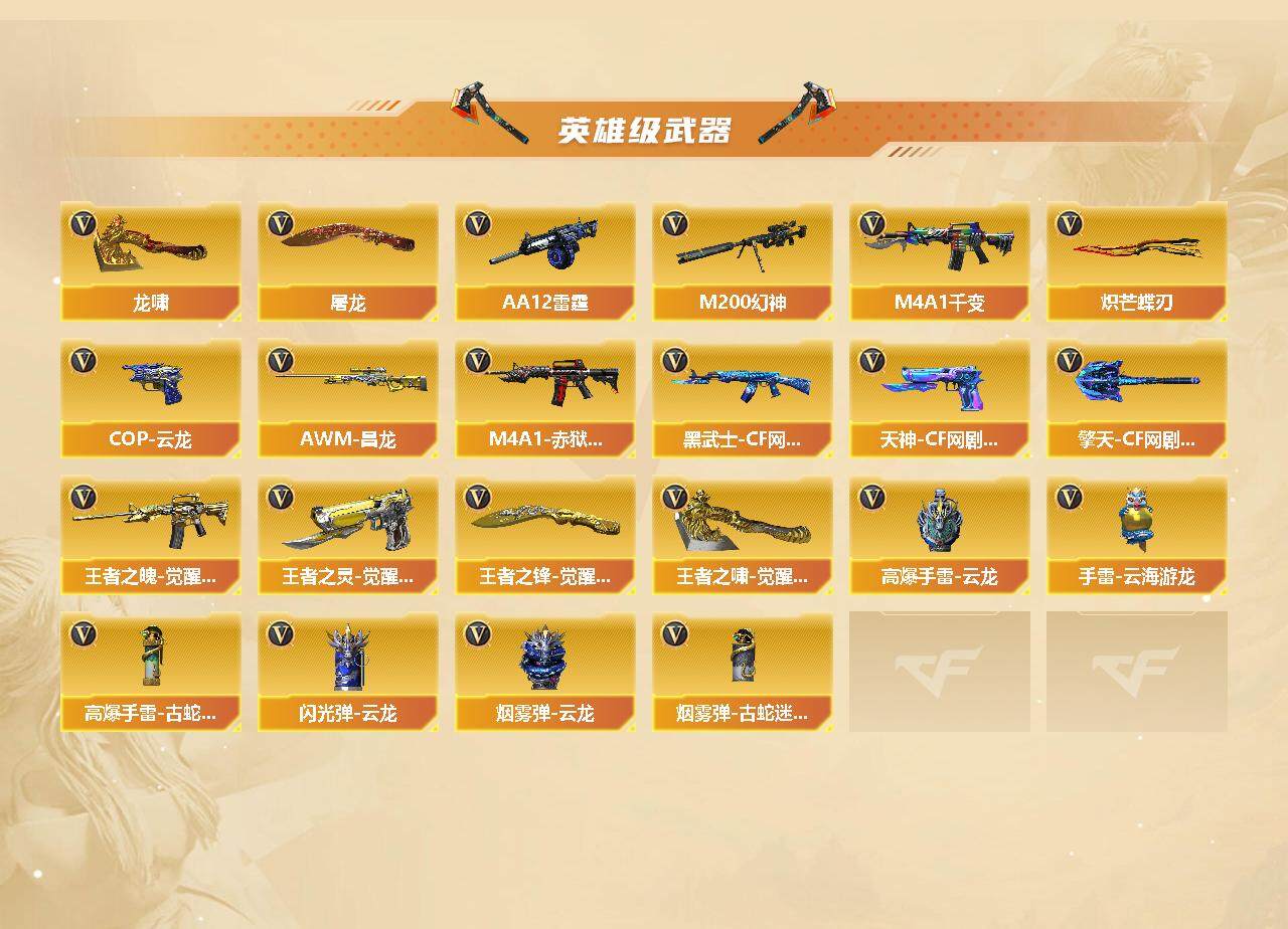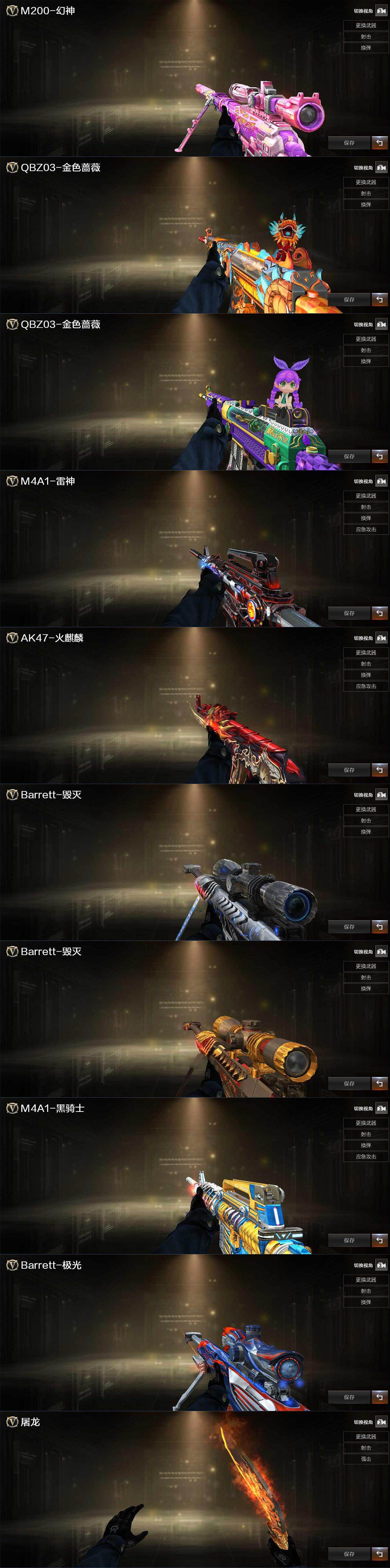 【热门武器】:传说光耀,传说破晓,QBZ03-金色蔷薇,Scar Light-白虎,M200-幻神,金色蔷薇-古蛇迷踪,修罗-古蛇迷踪,Cat-刀锋,M4A1-黑骑士,汤姆逊