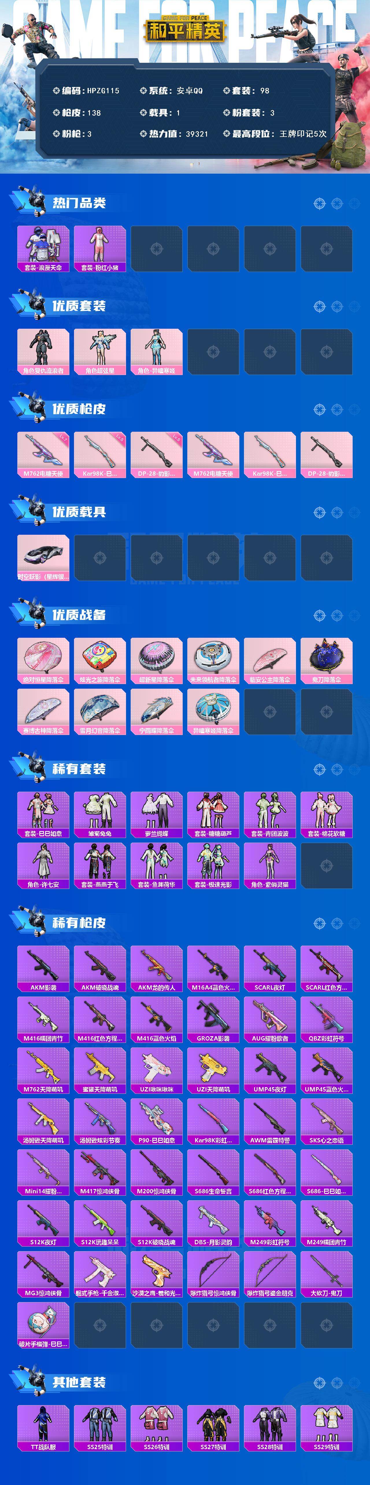【HPZG115】98套装/枪械3/装备180/载具1/战备109/王牌印记5/热力值39321/七级M762-电糖天使/五级Kar98K-巳巳如意/五级DP-28-豹影疾电/套装-浪漫天命/套装-粉红小猪/复仇流浪者/超弦星/角色-异瞳寒姬/时空跃影(星辉银)/M762-电糖天使/Kar98K-巳巳如意/DP-28-豹影疾电/绝对恒星降落伞/炫光之旅降落伞/超新星降落伞/未来领航者降落伞/临安公主降落伞/鬼刀降落伞/赛博古神降落伞/雪月幻音降落伞/宁雨蝶降落伞/异瞳寒姬降落伞/炫彩糖果降落伞/