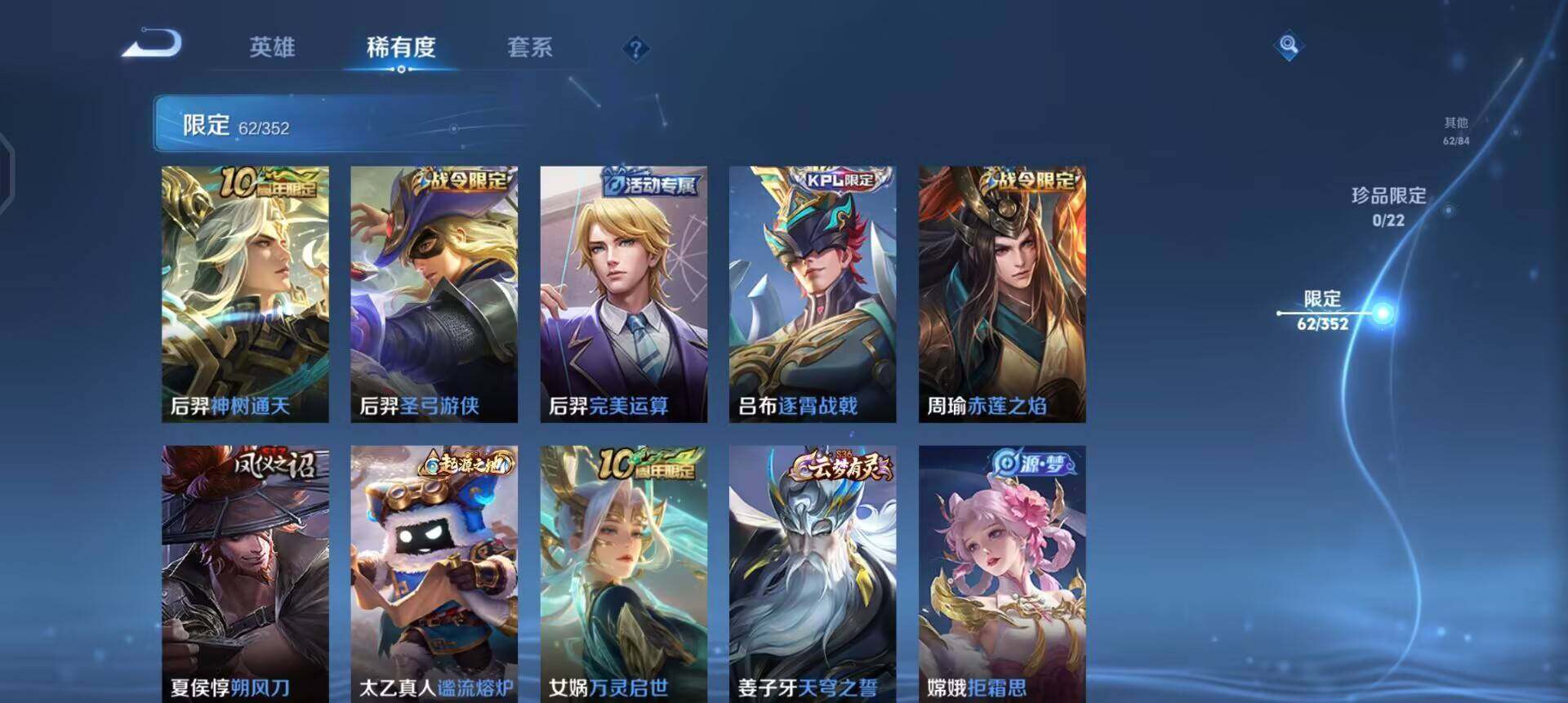【传说皮肤】:后羿神树通天,桑启鸣野蒿,孙悟空齐天大圣,孙尚香音你闪耀,李信一念神魔,后羿黄金射手座,宫本武藏地狱之眼