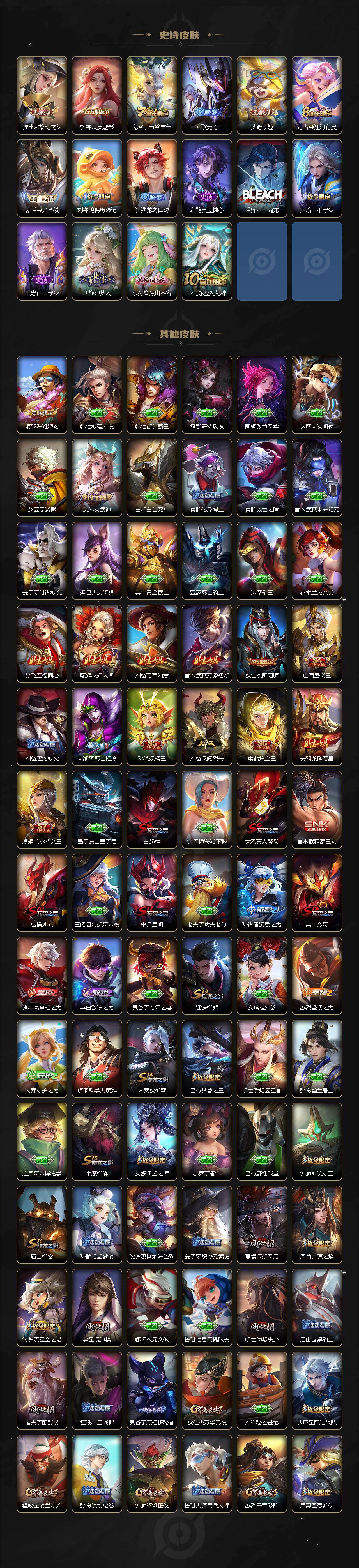 【限定皮肤】:白起狰,狄仁杰阴阳师,虞姬凯尔特女王,赵云皇家上将,嬴政白昼王子,孙尚香蔷薇恋人,鲁班七号狮舞东方,庄周蜃楼