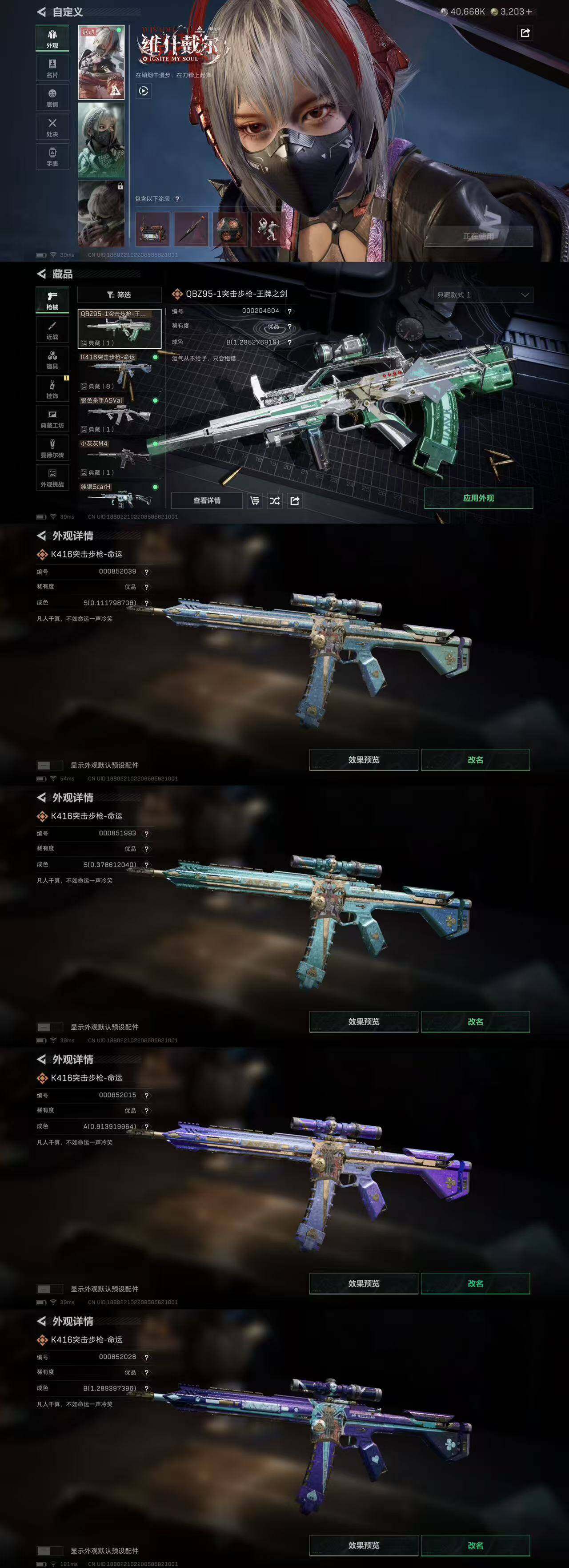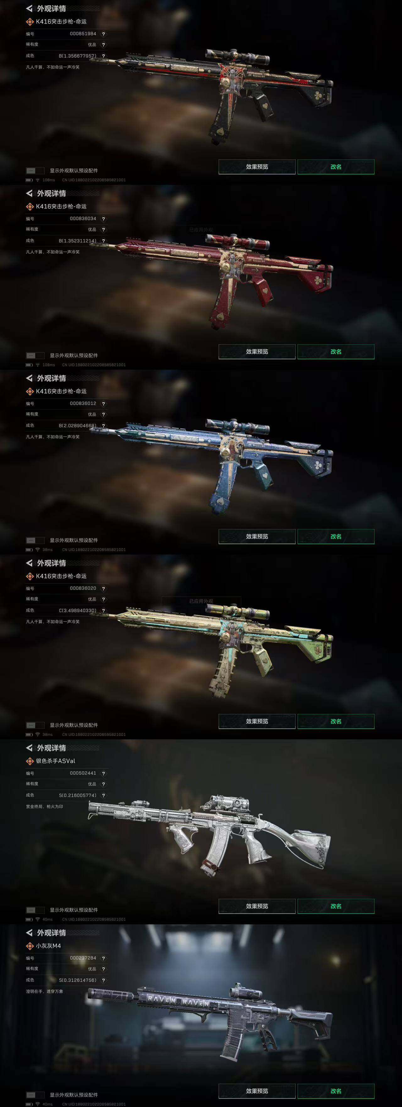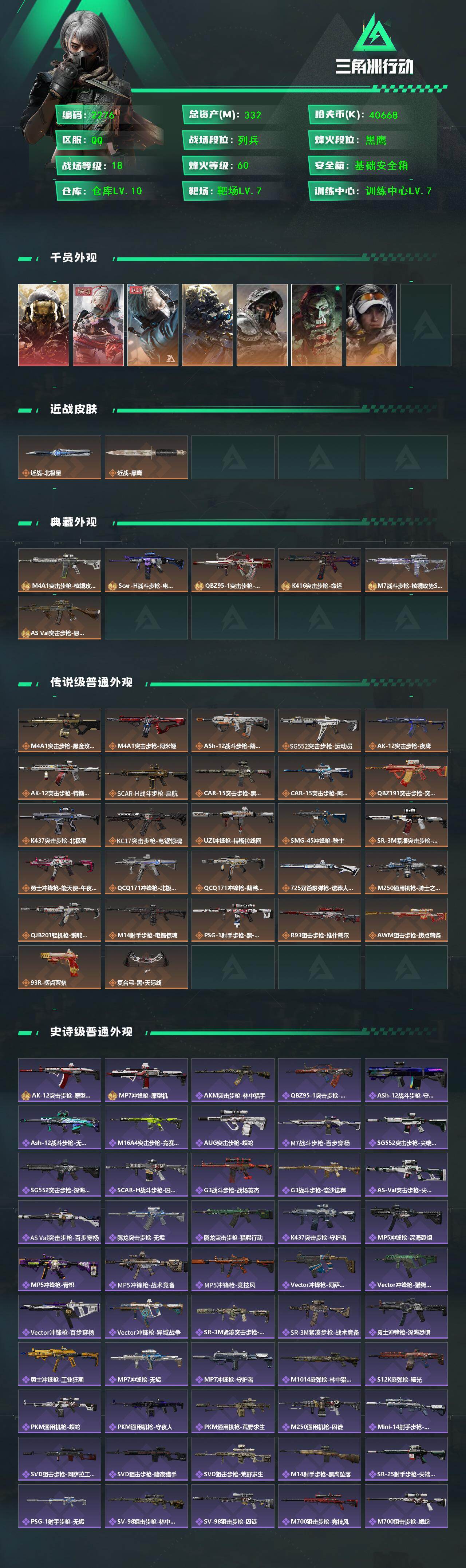 332M 红狼玫瑰和电锯 夜鹰 蜂医送葬人 深蓝不破誓约 露娜金牌射手 骇爪联动 刀皮北极星 8把典藏K416 优品B王牌之剑 优品S悬赏令 优品S棱镜M4 优品S电玩 优品S棱镜S2 10仓7体7负重 多咖啡豆 12发AW 有通行证 3203三角卷