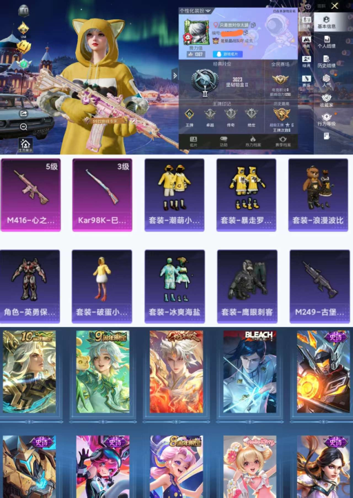 号-王者80皮肤3传说连体号-112套装112枪皮6王牌印记-M416-心之恋语-潮萌小黄鸭-暴走罗小黑-浪漫波比-地铁天赋已开】Q等级33(2太阳)(吃鸡王者)一体号80皮肤3传说17史诗21限定- 安卓Q-2特效枪10热门112套装112枪皮 33957热力值 6印记 历史超级王牌6星 【2特效枪】 M416-心之恋语 (5级) Kar98K-巳巳如意 (3级) 【10热门
