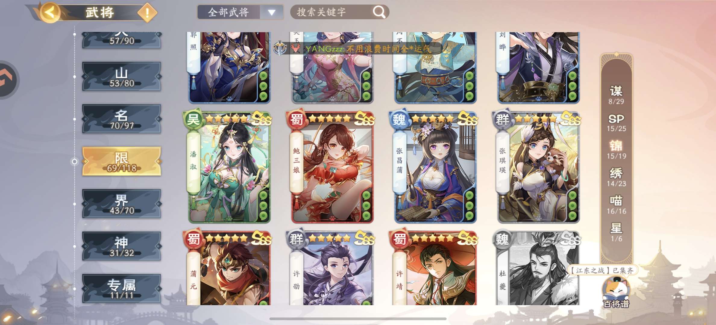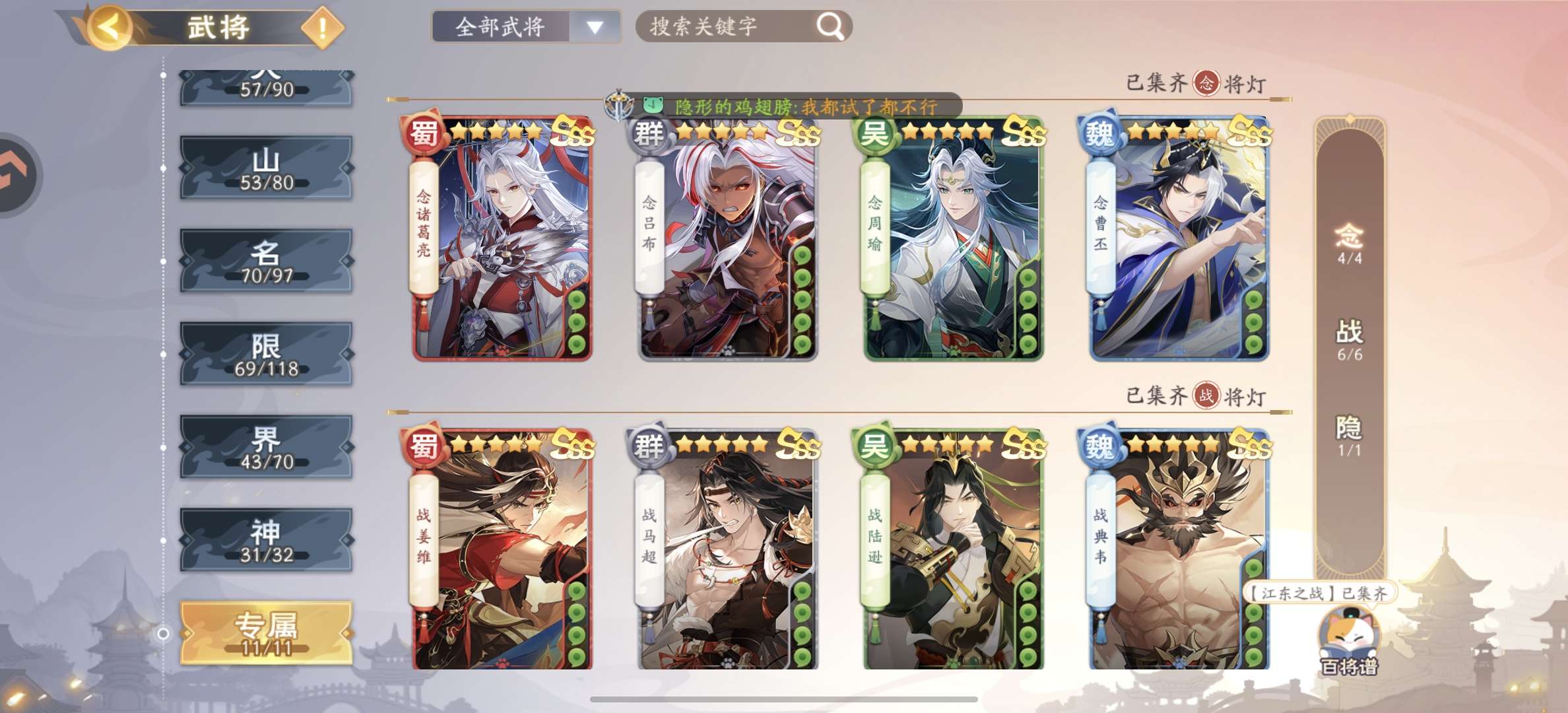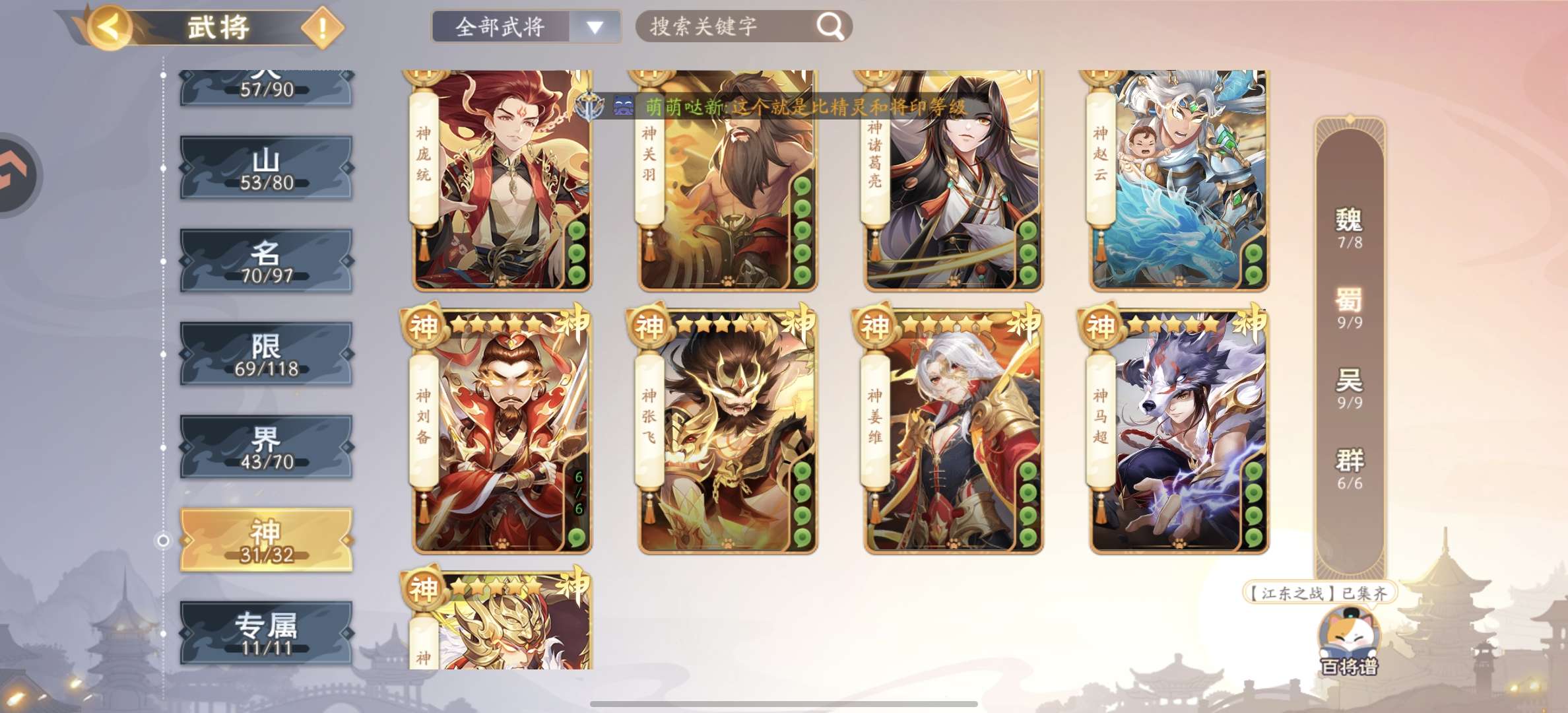 六战4念一隐,双头夫人和夫人都有,1680武将基本都有,背包还有5个水晶48猫眼30多个突破石