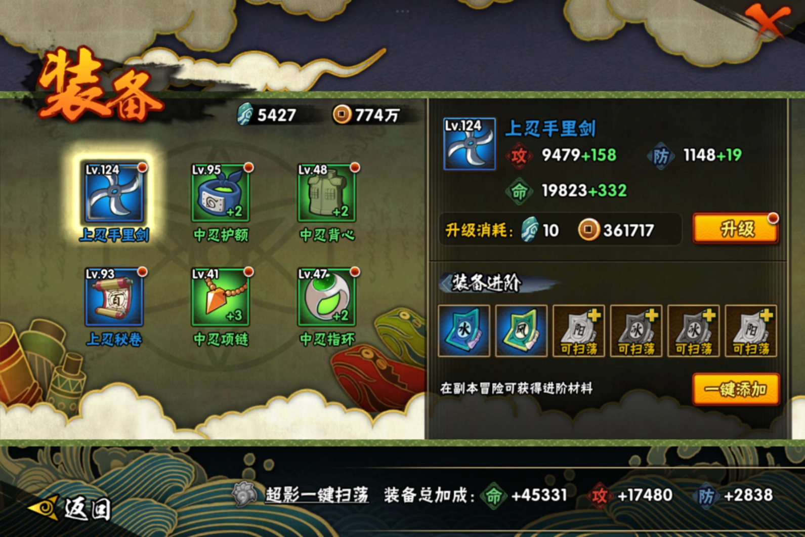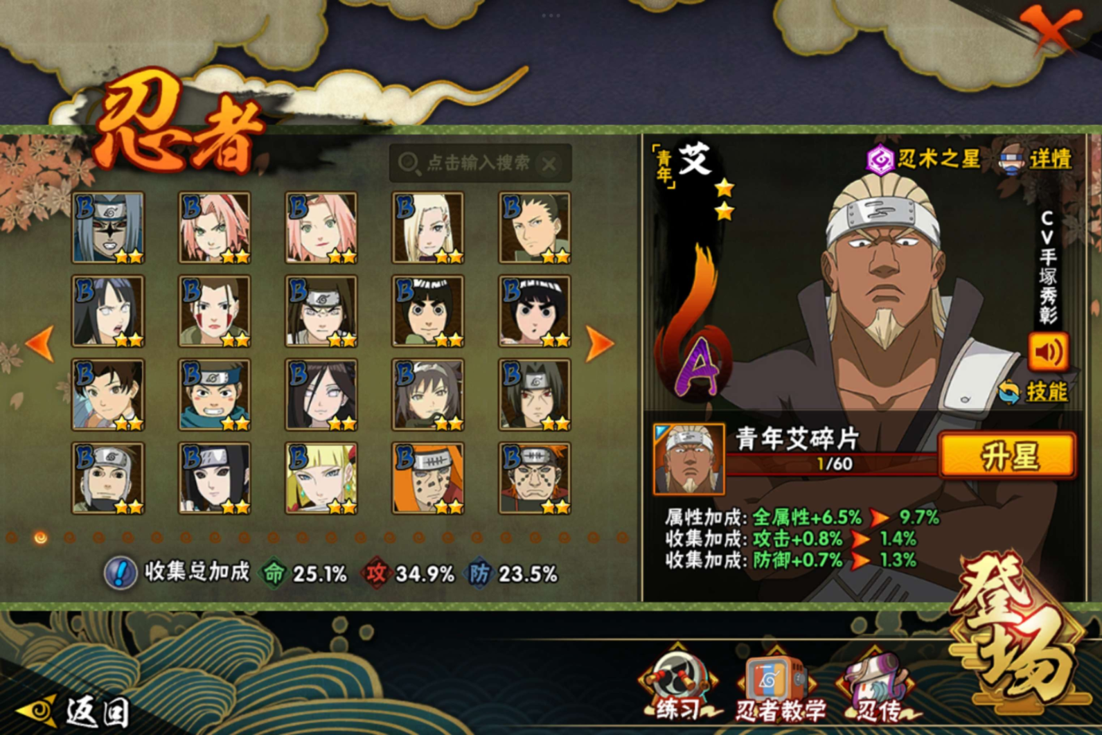 【A级忍者】宇智波佐助「须佐能乎」(2星),宇智波泉奈(2星),志村团藏(2星),干柿鬼鲛(2星),蝎(2星),我爱罗「疾风传」(2星),波风水门「青年」(2星),艾「青年」(2星),神秘面具男「忍者之路」(2星),漩涡博人