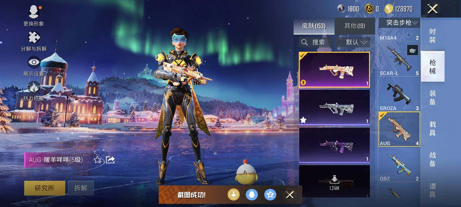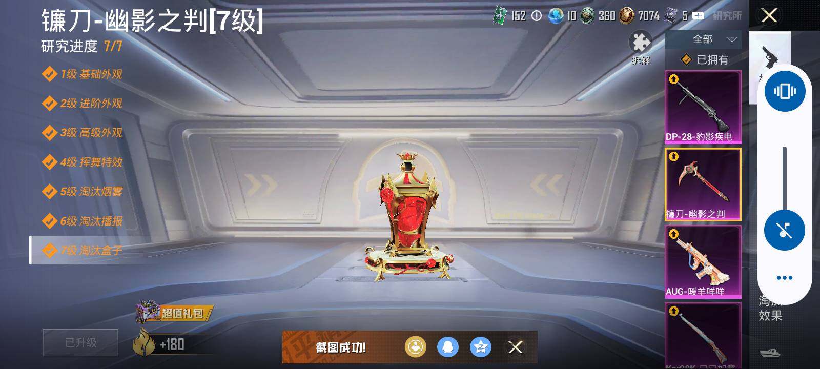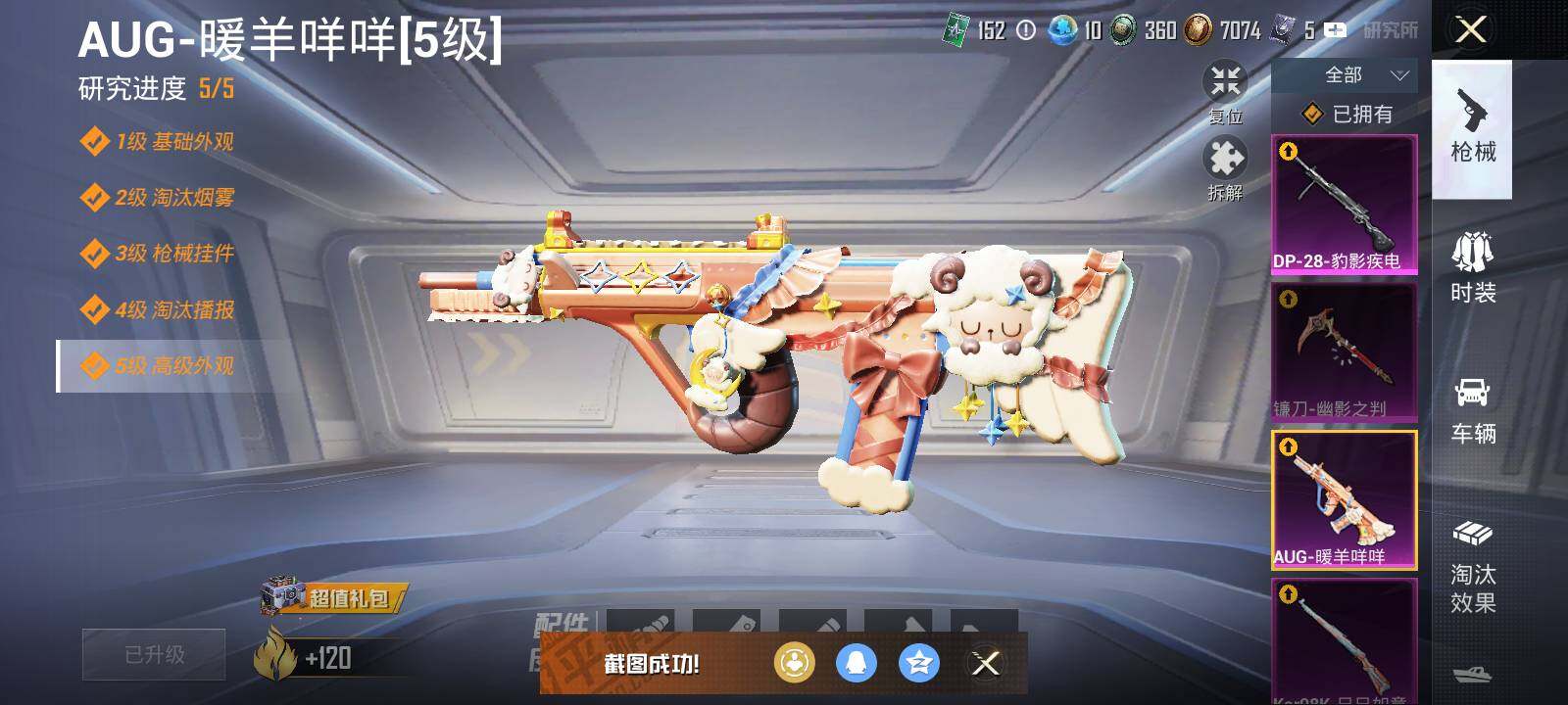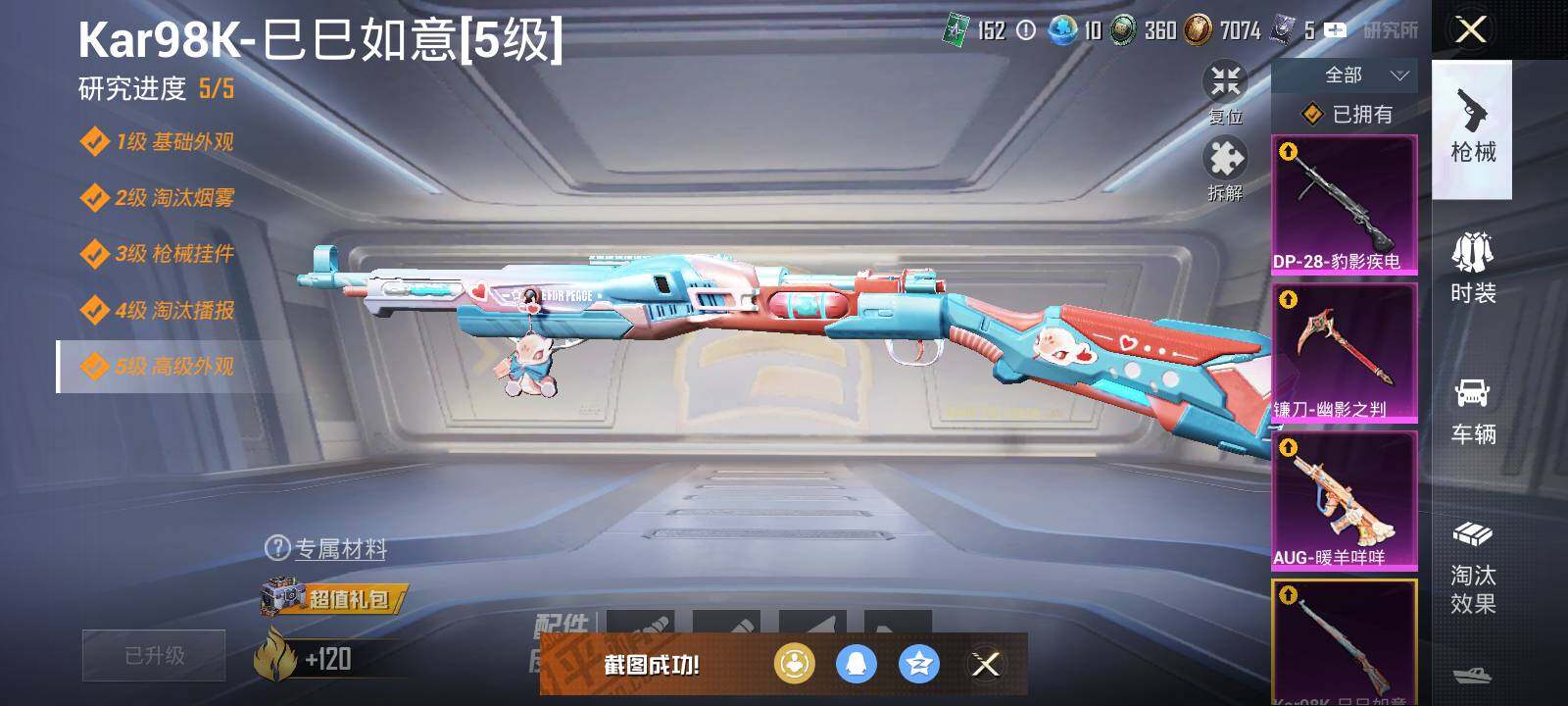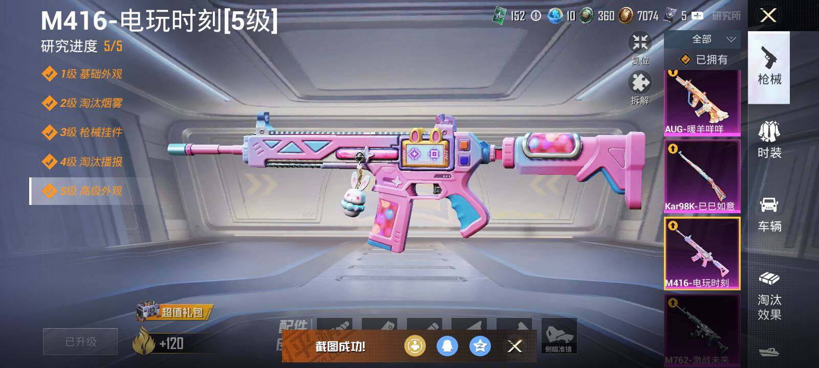 【粉色枪皮等级】:M416-电玩时刻(五级),AUG-暖羊咩咩(五级),M762-激战未来(七级),Kar98K-巳巳如意(五级),DP-28-豹影疾电(五级),镰刀-幽影之判(七级)