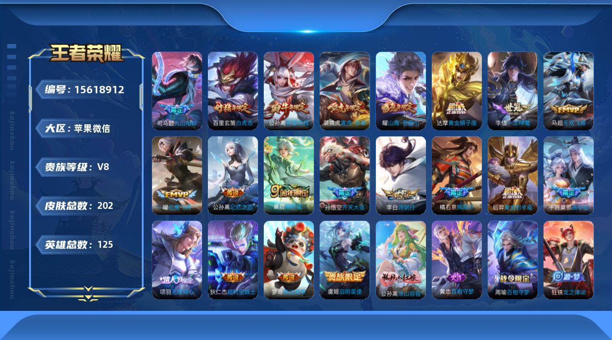 [15618912]V8 20传说 125英雄 202皮肤 可修改实名