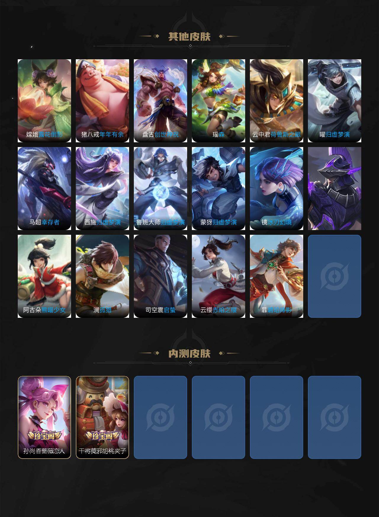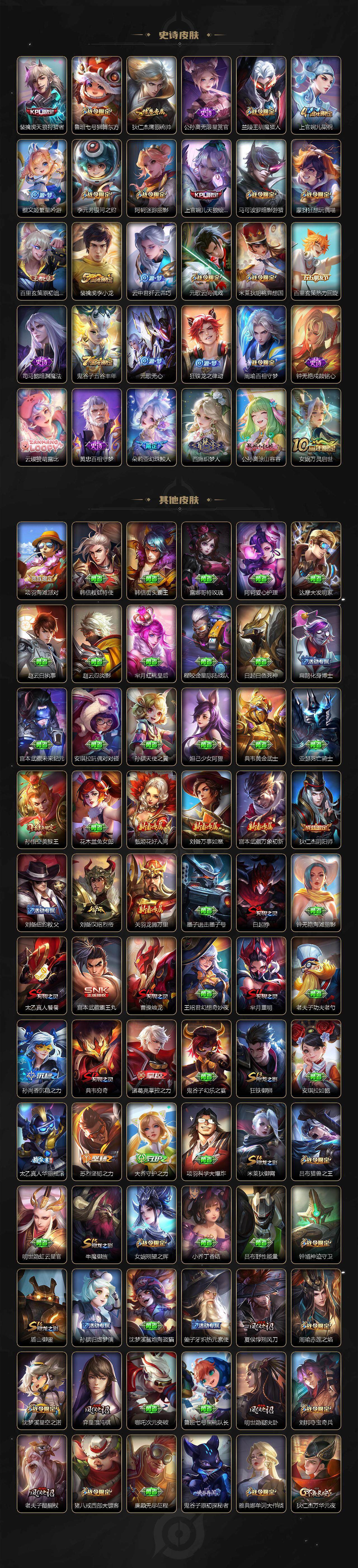 【传说皮肤】 神树通天 鸣野蒿 逐花归海 战鼓燎原 祥瑞亨通 愿照·岁时盈 落雪白狼 无双飞将 花朝如约 黄金狮子座 久胜战神 炽阳神光 地狱火 零号·赤焰 云鹰飞将 启明星使
