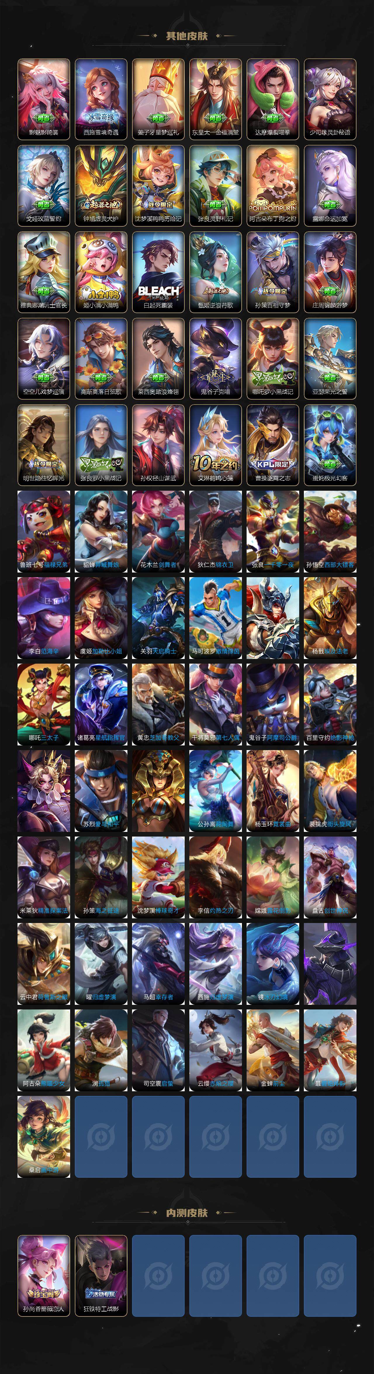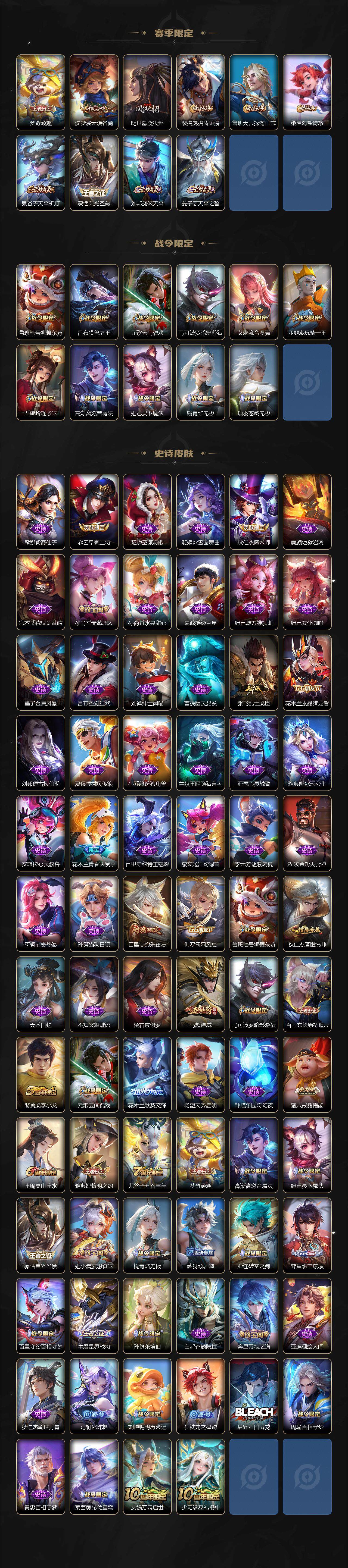 【传说皮肤】 神树通天 鸣野蒿 曦玄引 幻光神枪 愿照·九州拓 愿照·岁时盈 纵目迁山 无双飞将 祈雪灵祝 地狱之眼 武圣 冠军飞将 炽阳神光 一念神魔 末日机甲
