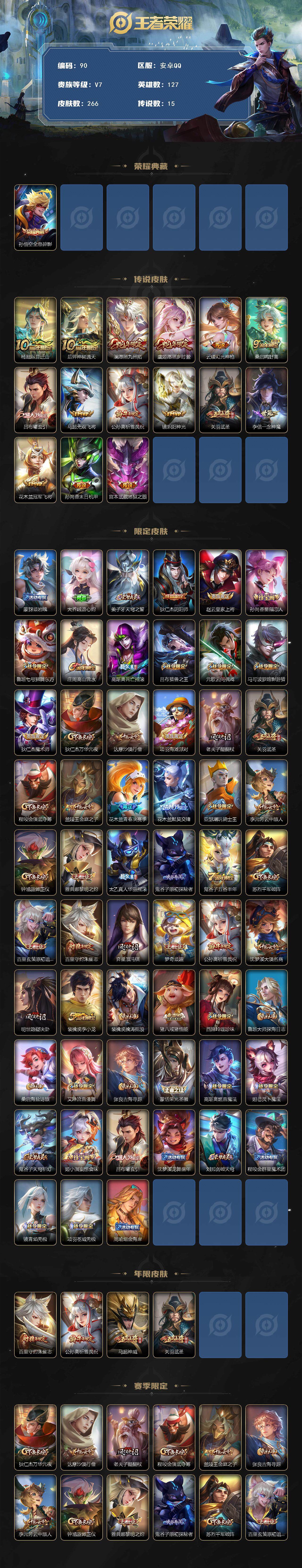 WLWZ901【65段对抗路发育路37段V7 传说15 典藏1 星传说1 省二1w2花木兰 1w1万战关羽 1w5战马超 金标蒙恬 金标李信 65段对抗路发育路37段】安卓Q-荣耀王者-127英雄-266皮肤-1典藏-15传说-75史诗