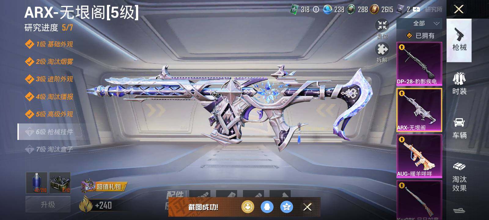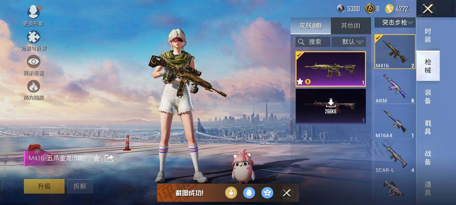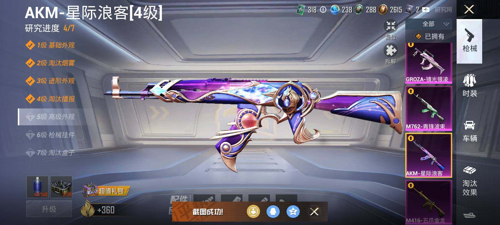 【粉色枪皮等级】:AKM-星际浪客(四级),M416-五爪金龙(五级),GROZA-镜光银凌(五级),AUG-暖羊咩咩(五级),M762-青锋波束(五