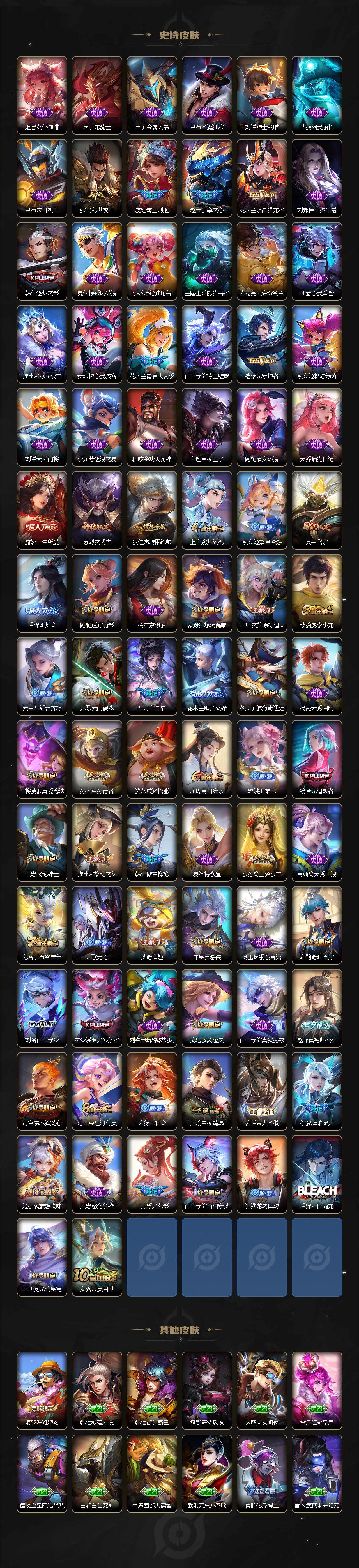 【史诗皮肤】 百相守梦 岱宗 逐梦之影 傲雪梅枪 如梦令 青春决赛季 默契交锋 银翎春语 一生所爱 电玩小子 白晶晶 玄武志 孙行者 龙之律动 地狱燃心