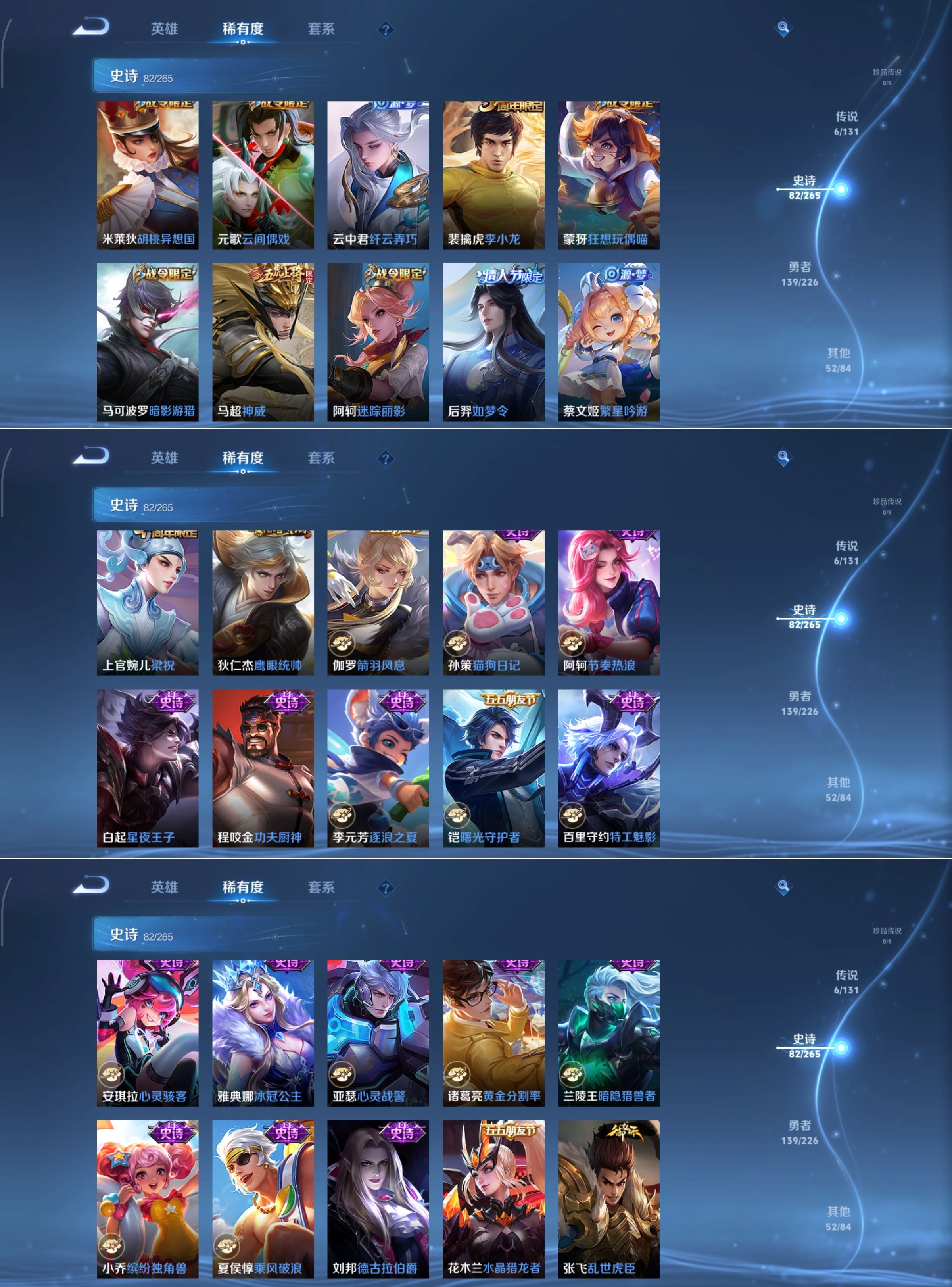 【史诗皮肤】 蔬乡物语 蔬乡物语 茶境仙 百相守梦 傲雪梅枪 如梦令 布丁狗之约 谧流熔炉 电玩小子 神威 孙行者 鸭鸭历险记 龙之律动 戍鼓铭心 威尼斯狂欢 罗小黑战记 百相守梦 踏浪烽翎 琥珀纪元 苍威无极 百相守梦 漠中幻影 超时空战士 巫礼祀神 光弋星穹 万灵启世 罗小