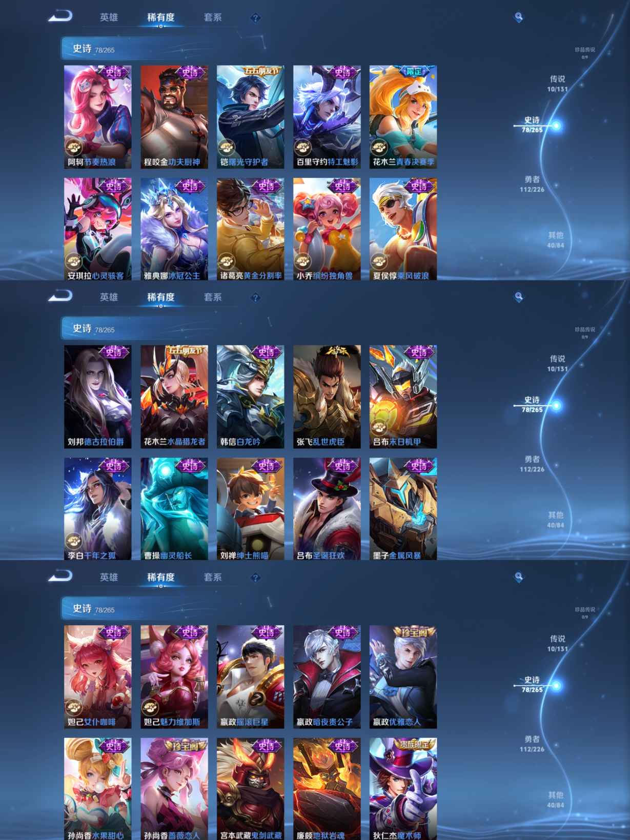 【史诗皮肤】 破空之剑 战舞者 星界战将 冰霜恋舞曲 青春决赛季 布丁狗之约 谧流熔炉 电玩小子 神威 孙行者 龙之律动 熊喵少女 威尼斯狂欢 踏浪烽翎 琥珀纪元 雪夜绮愿 聚星闪耀 江河有灵 百解令 荣光圣徽 百相守梦 漠中幻影 顽岩魄 藏狐·褐绒 罗小黑战记 玉兔