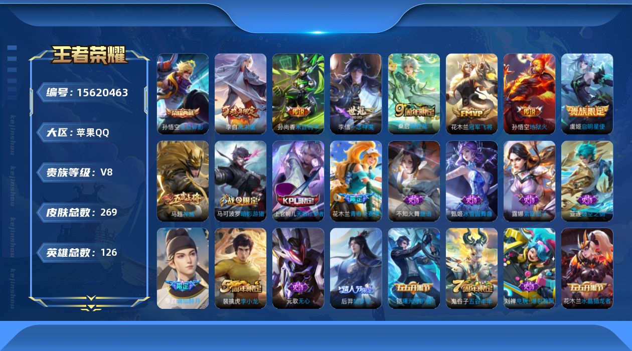 V8 1典藏 7传说 126英雄 269皮肤 可修改实名 【英雄全皮】:蒙恬全