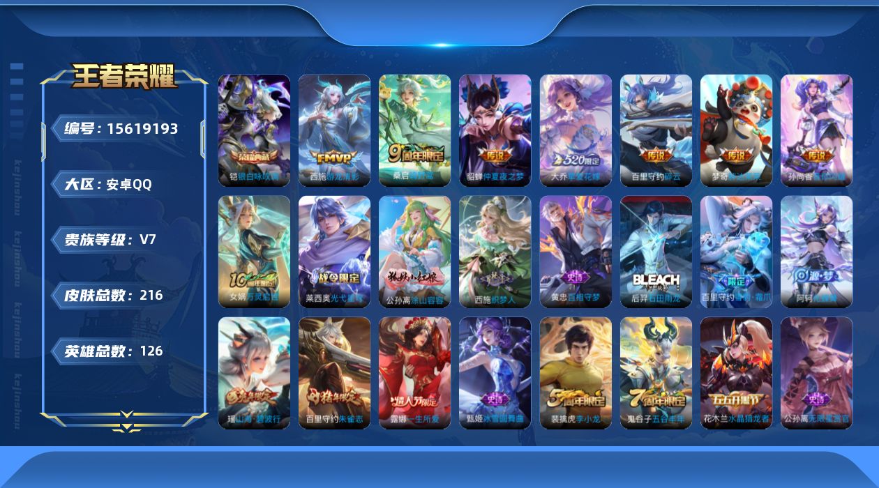 [15619193]V7 1典藏 8传说 126英雄 216皮肤 可修改实名 背包里面有一颗荣耀水晶