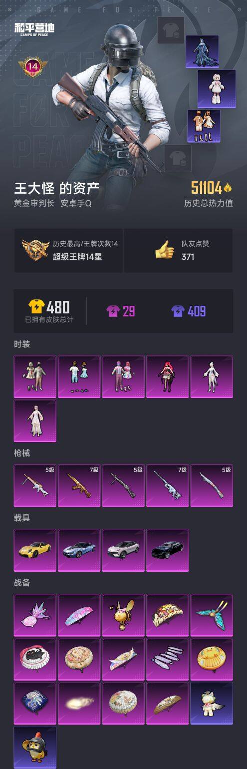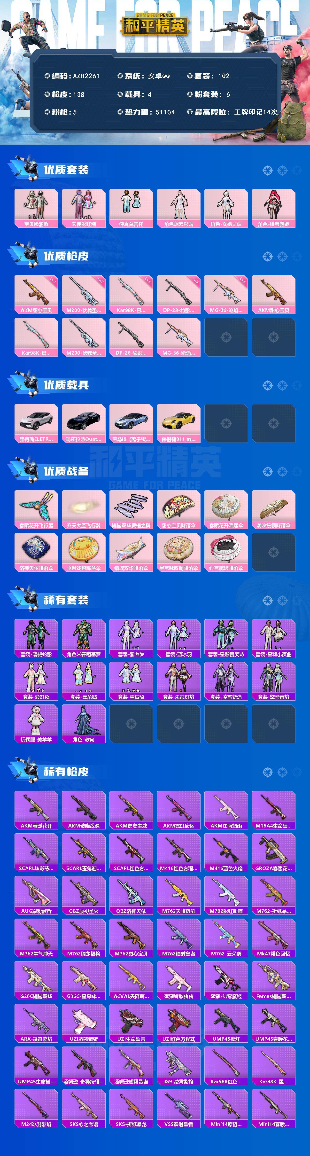 【AZH2261】安卓 手Q【14印记 宝贝奶油派 天使彩虹糖 仲夏莫吉托 女娲灵识 美羊羊 满级甜心宝贝AKM 满级伏羲圣卦M200 4载具】6粉装-5特效枪-4载具-5粉色飞行器-51104热力值-14王牌印记-102套装-138枪皮
