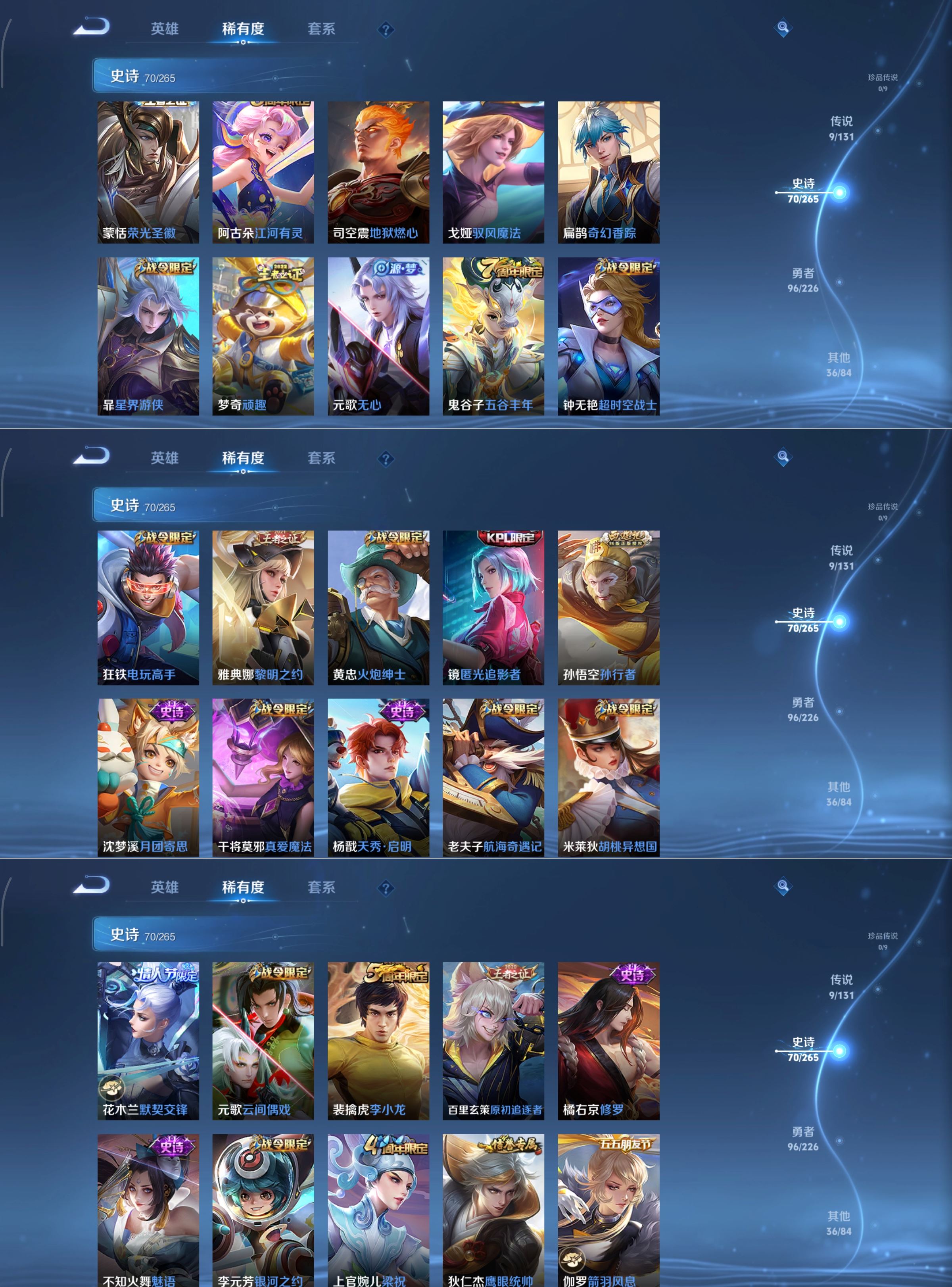 【史诗皮肤】 星界战将 冰锋战神 逐梦之影 默契交锋 谧流熔炉 电玩小子 至尊宝 孙行者 龙之律动 地狱燃心 青焰无极 百相守梦 踏浪烽翎 苍威无极 王牌新星 江河有灵 幻夜行动 荣光圣徽 百相守梦 超时空战士 光弋星穹 万灵启世 傩神司 化蝶舞 奇幻香踪 星界游侠 顽趣 驭风魔法 魅语 幽灵船长