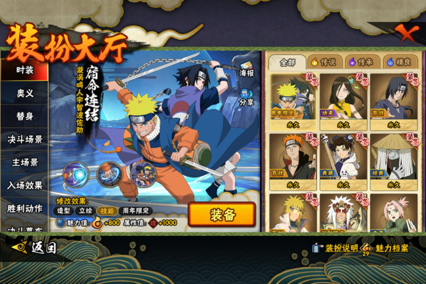 【S级忍者】宇智波佐助「永恒万花筒」(3星),自来也「舞之豪杰」(3星),宇智波鼬「须佐能乎」(3星),佩恩「天道」(3星),波风水门(3星),
