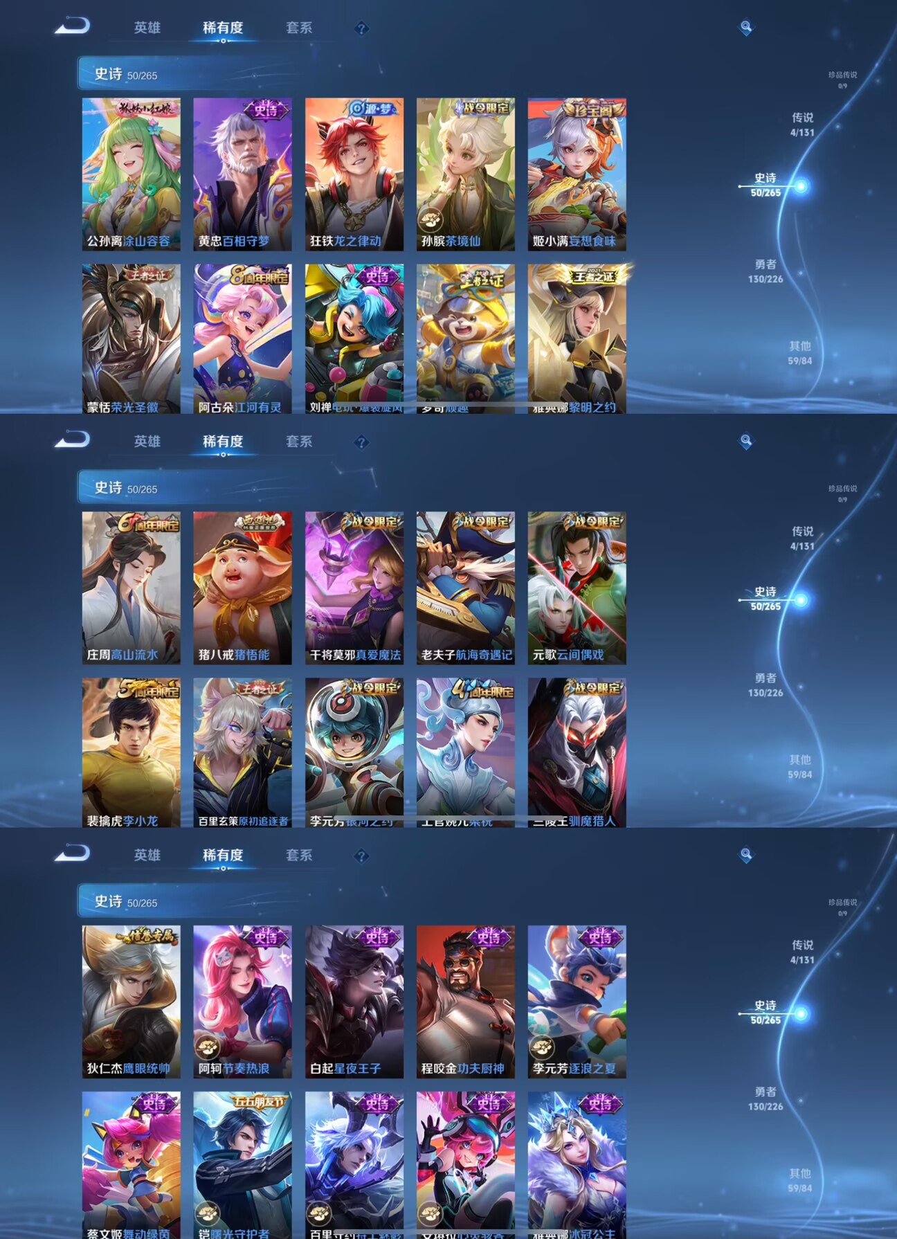 【史诗皮肤】 茶境仙 布丁狗之约 谧流熔炉 涂山容容 龙之律动 熊喵少女 威尼斯狂欢 罗小黑战记 踏浪烽翎 聚星闪耀 江河有灵 荣光圣徽 百相守梦 顽趣 舞动绿茵 幽灵船长 功夫厨神 女仆咖啡 魅力维加斯 魔术师 鹰眼统帅 圣诞恋歌 真爱魔法 鬼剑武藏 水晶猎龙者 曙光守护者 暗隐猎兽者 驯魔猎人 航海奇遇记 逐浪之夏 银河之约 地狱岩魂 金属