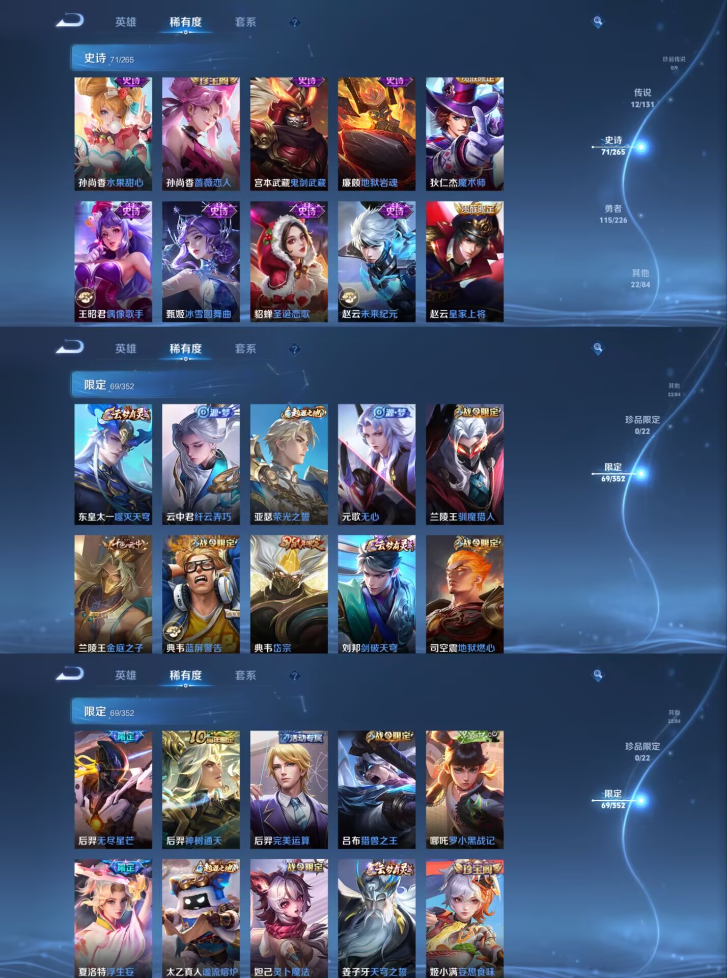 【史诗皮肤】 蔬乡物语 蔬乡物语 岱宗 青龙志 布丁狗之约 谧流熔炉 电玩小子 孙行者 龙之律动 地狱燃心 罗小黑战记 青焰无极 怒海争锋 踏浪烽翎 夏日便利店 苍威无极 聚星闪耀 百解令 百相守梦 漠中幻影 巫礼祀神 光弋星穹 奇幻香踪 星界游侠 朱雀志 魅语 舞动绿茵 幽灵船长 拒霜思 功夫厨神