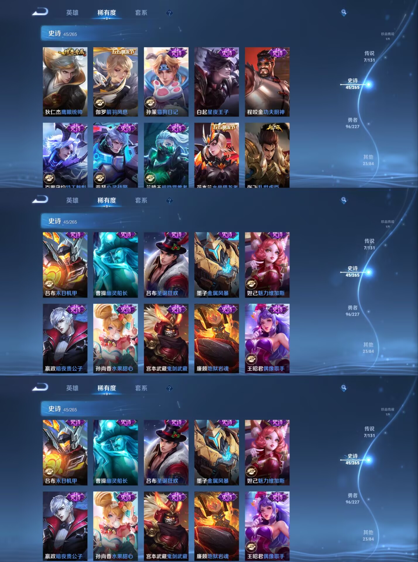 【史诗皮肤】 百相守梦 布丁狗之约 谧流熔炉 涂山容容 地狱燃心 谪仙醉月 威尼斯狂欢 踏浪烽翎 聚星闪耀 江河有灵 决胜大满贯 百相守梦 顽岩魄 万灵启世 化蝶舞 石田雨龙 魅语 幽灵船长 繁星吟游 功夫厨神 魅力维加斯 鹰眼统帅 圣诞恋歌 箭羽风息 鬼剑武藏 水晶猎