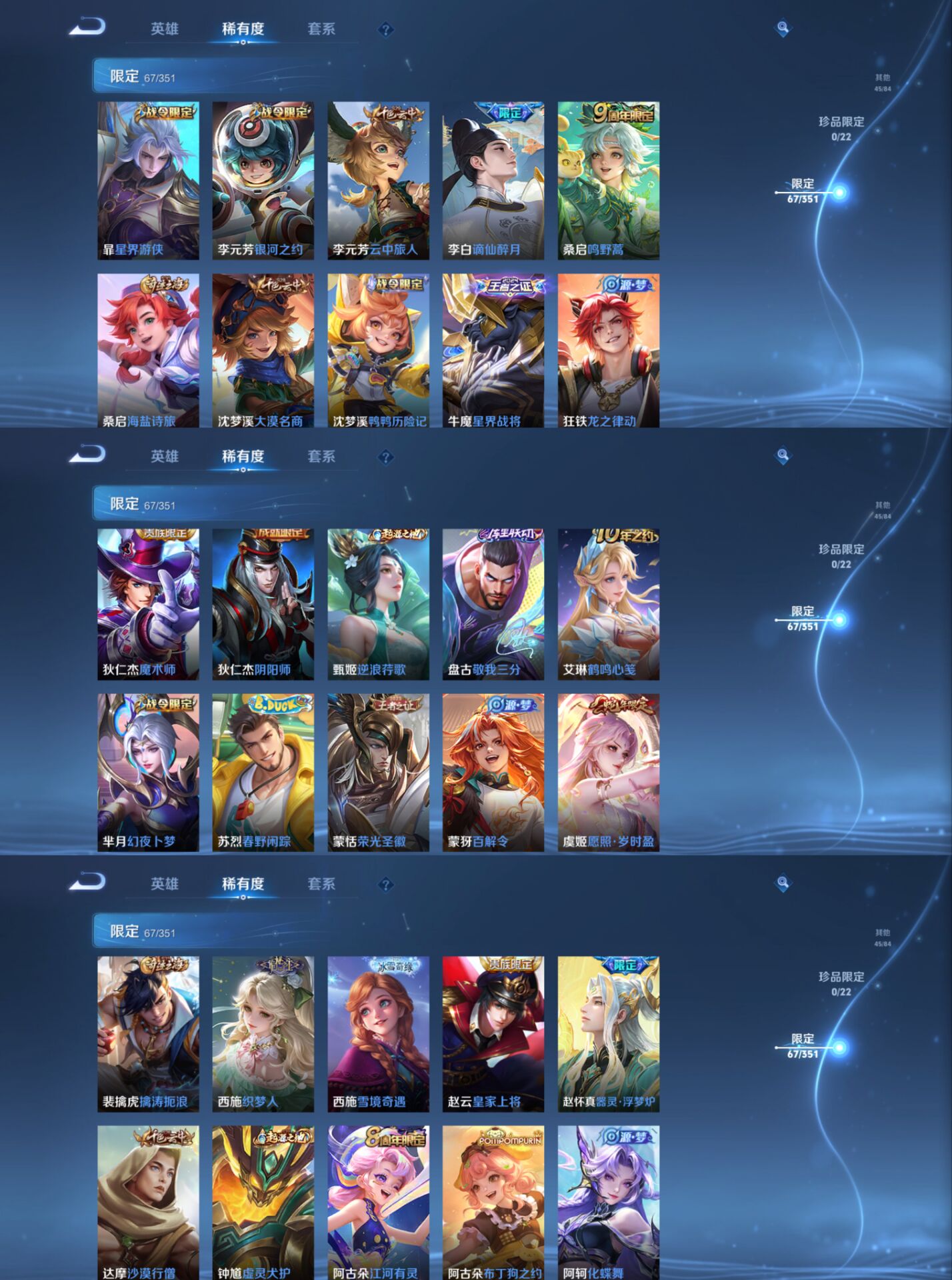 【史诗皮肤】 破空之剑 茶境仙 星界战将 器灵·浮梦炉 布丁狗之约 谧流熔炉 电玩小子 至尊宝 鸭鸭历险记 龙之律动 谪仙醉月 罗小黑战记 百相守梦 踏浪烽翎 王牌新星 聚星闪耀 江河有灵 百解令 荣光圣徽 百相守梦 漠中幻影 织梦人 绮世丹青 万灵启世 化蝶舞 星界游侠 舞动绿茵 拒霜思 女