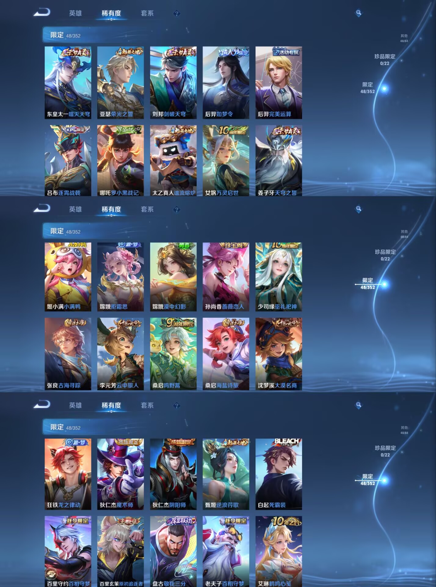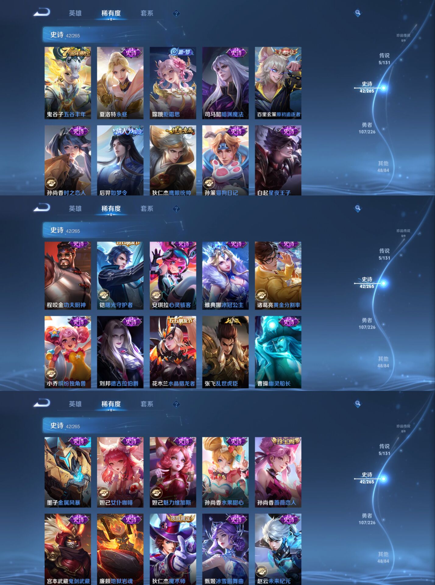 【史诗皮肤】 百相守梦 如梦令 布丁狗之约 谧流熔炉 龙之律动 威尼斯狂欢 罗小黑战记 踏浪烽翎 江河有灵 百解令 百相守梦 漠中幻影 顽岩魄 织梦人 巫礼祀神 万灵启世 化蝶舞 幽灵船长 拒霜思 功夫厨神 女仆咖啡 魅力维加斯 魔术师 鹰眼统帅 鬼剑武藏 水晶猎龙者 曙光守护者 地狱岩魂 德古拉伯爵 紫霞仙子 金属风暴 暗渊魔法 猫狗日记 水果甜心 蔷薇恋人 时之恋人 缤