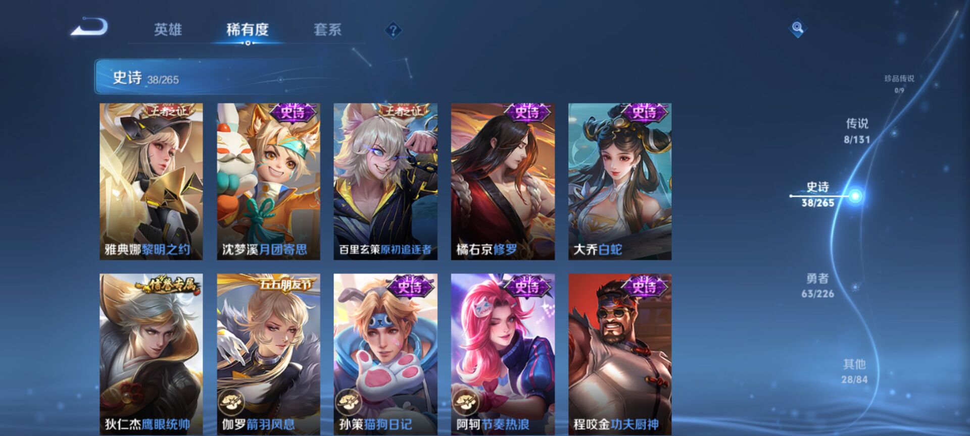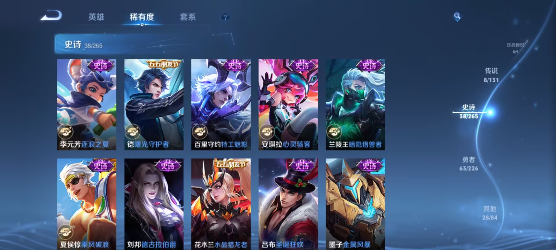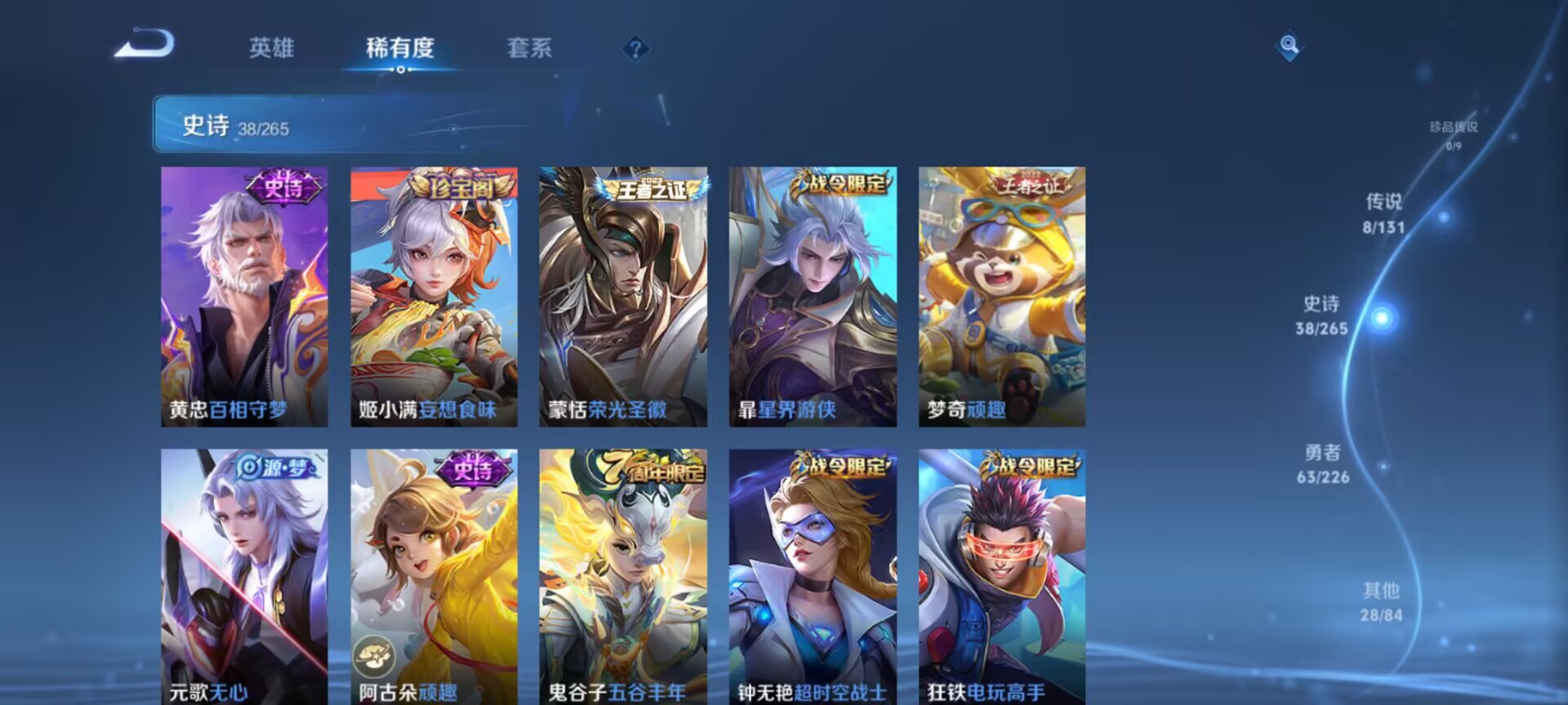 【史诗皮肤】 布丁狗之约 谧流熔炉 熊喵少女 踏浪烽翎 荣光圣徽 百相守梦 超时空战士 星界游侠 顽趣 功夫厨神 女仆咖啡 魅力维加斯 白蛇 魔术师 鹰眼统帅 箭羽风息 鬼剑武藏 水晶猎龙者 修罗 曙光守护者 暗隐猎兽者 逐浪之夏 德古拉伯爵 圣诞狂欢 金属风暴 月团寄思 猫狗日记 水果甜心 偶像歌手 乘风破浪 黎明之约 皇家上将 冰雪圆舞