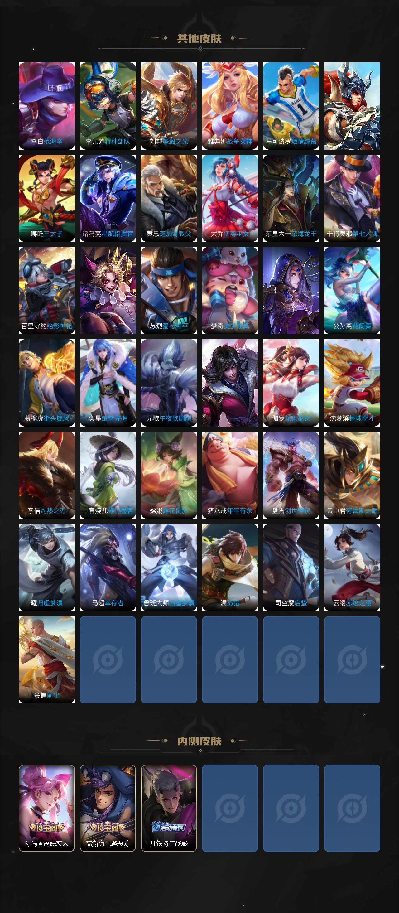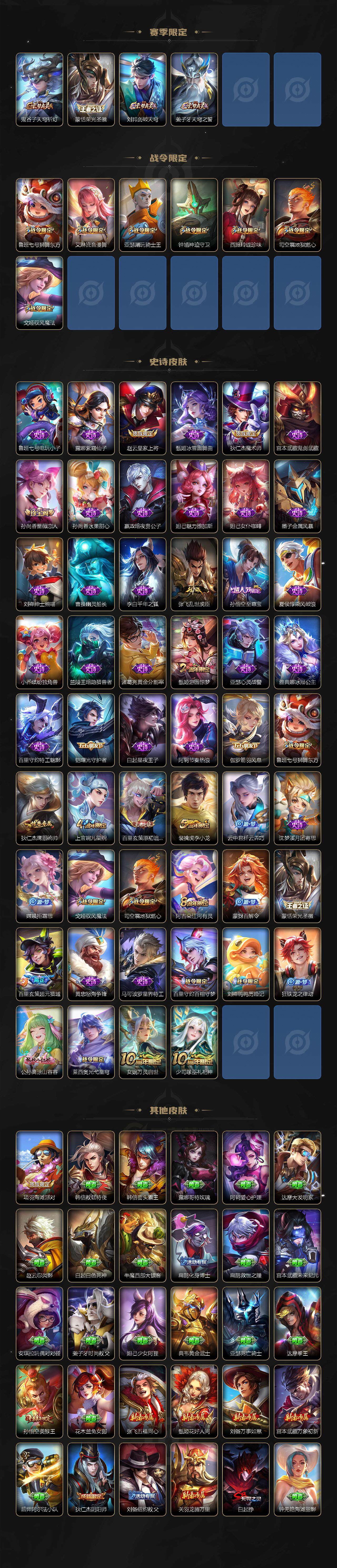【史诗皮肤】 百相守梦 布丁狗之约 电玩小子 涂山容容 至尊宝 鸭鸭历险记 龙之律动 地狱燃心 星界特工 威尼斯狂欢 罗小黑战记 怒海争锋 踏浪烽翎 聚星闪耀 江河有灵 幻夜行动 决胜大满贯 超元猎域 百解令 荣光圣徽 巫礼祀神 光弋星穹 万灵启世 驭风魔法 幽灵船长 拒霜思 女仆咖啡 魅力维加斯 魔术师