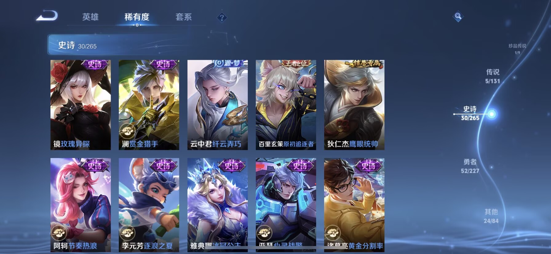 【史诗皮肤】 蔬乡物语 蔬乡物语 苍鳞隐世 器灵·浮梦炉 玫瑰异探 谧流熔炉 电玩小子 鸭鸭历险记 罗小黑战记 踏浪烽翎 百相守梦 光弋星穹 化蝶舞 女仆咖啡 魔术师 鹰眼统帅 鬼剑武藏 暗隐猎兽者 逐浪之夏 紫霞仙子 水果甜心 偶像歌手 冰冠公主 心灵战警 纤云弄巧