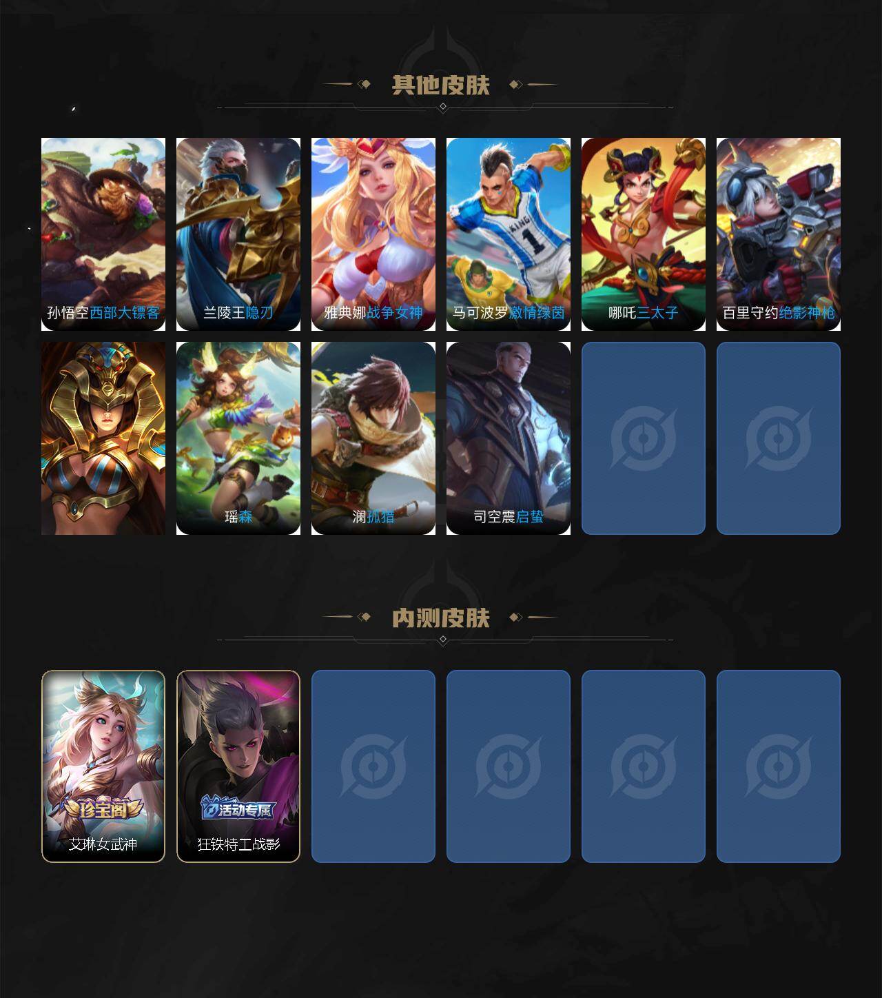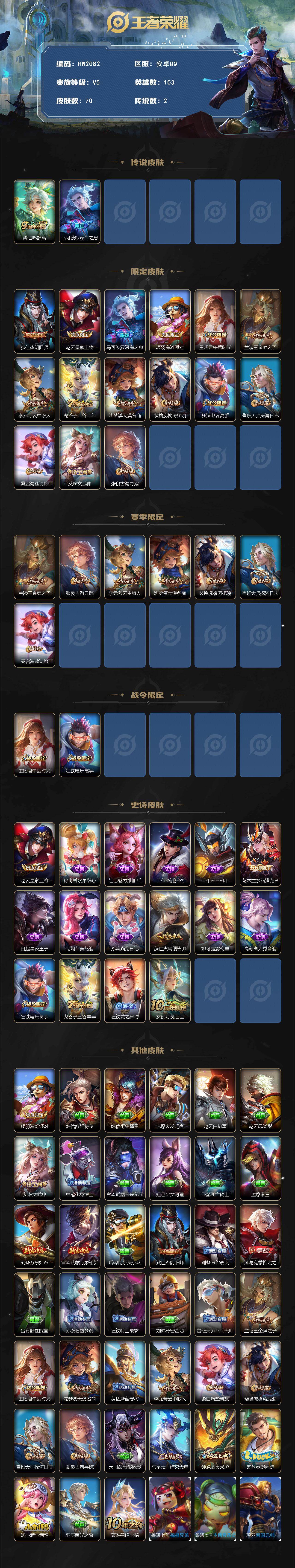 【限定皮肤】:狄仁杰阴阳师,赵云皇家上将,马可波罗深海之息,项羽海滩派对,王昭君午后时光,兰陵王金庭之子,李元芳云中旅人,鬼谷子五谷丰年,沈梦溪大漠名商,裴擒虎擒涛扼浪,狂铁电玩高手,鲁班大师探海日志,桑启海盐诗旅,艾琳女武神,张良古海寻踪