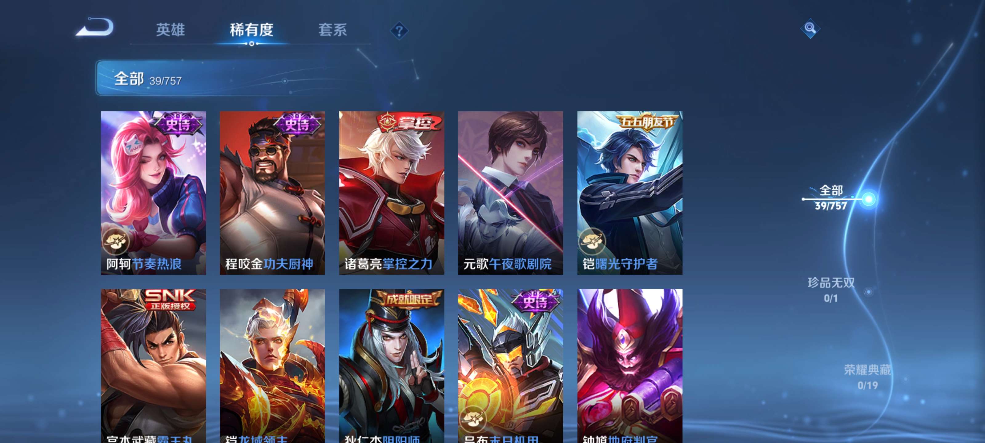 【史诗皮肤】 末日机甲 五谷丰年 无心 灵蛊蚀心 李小龙 功夫厨神 圣诞恋歌 冰雪圆舞曲 节奏热浪 曙光守护者 水果甜心