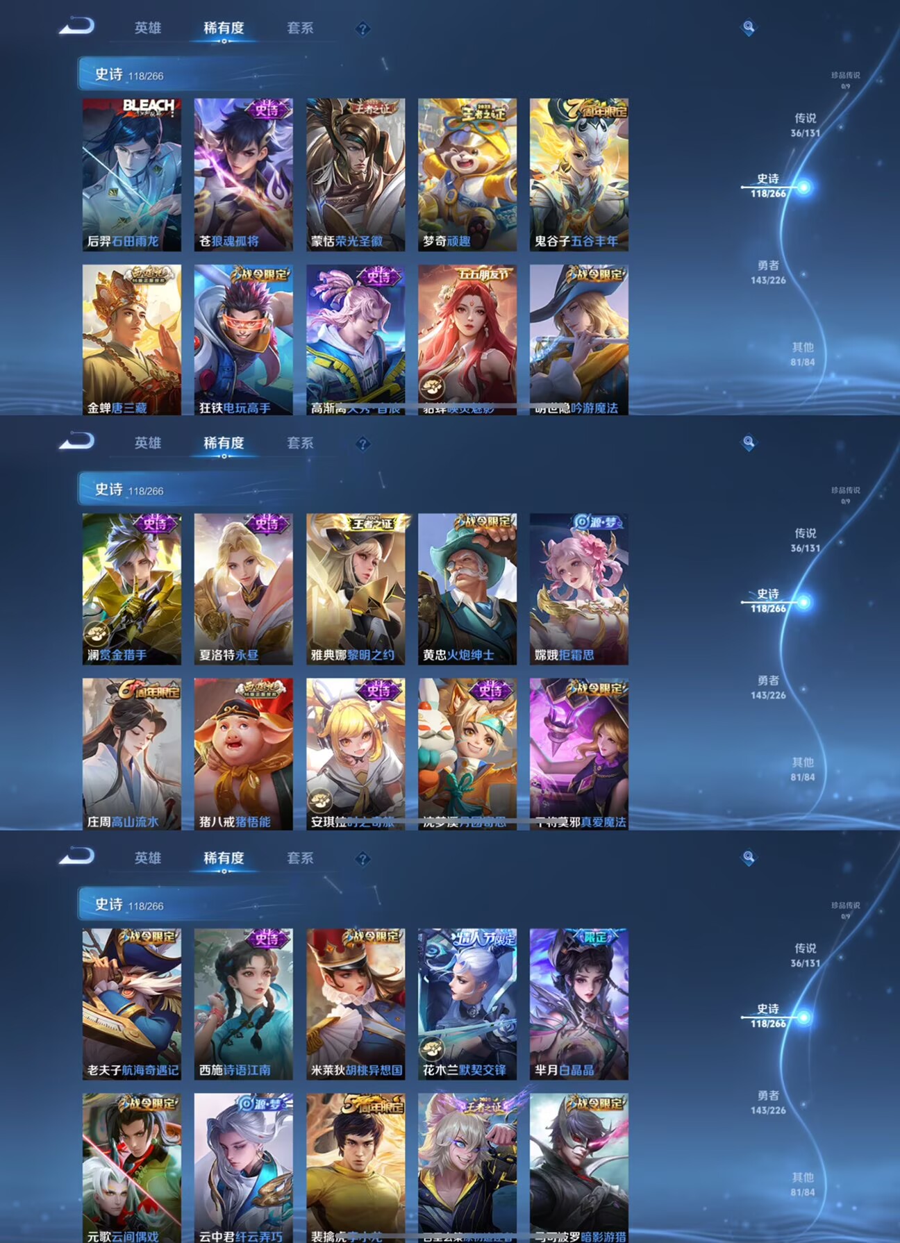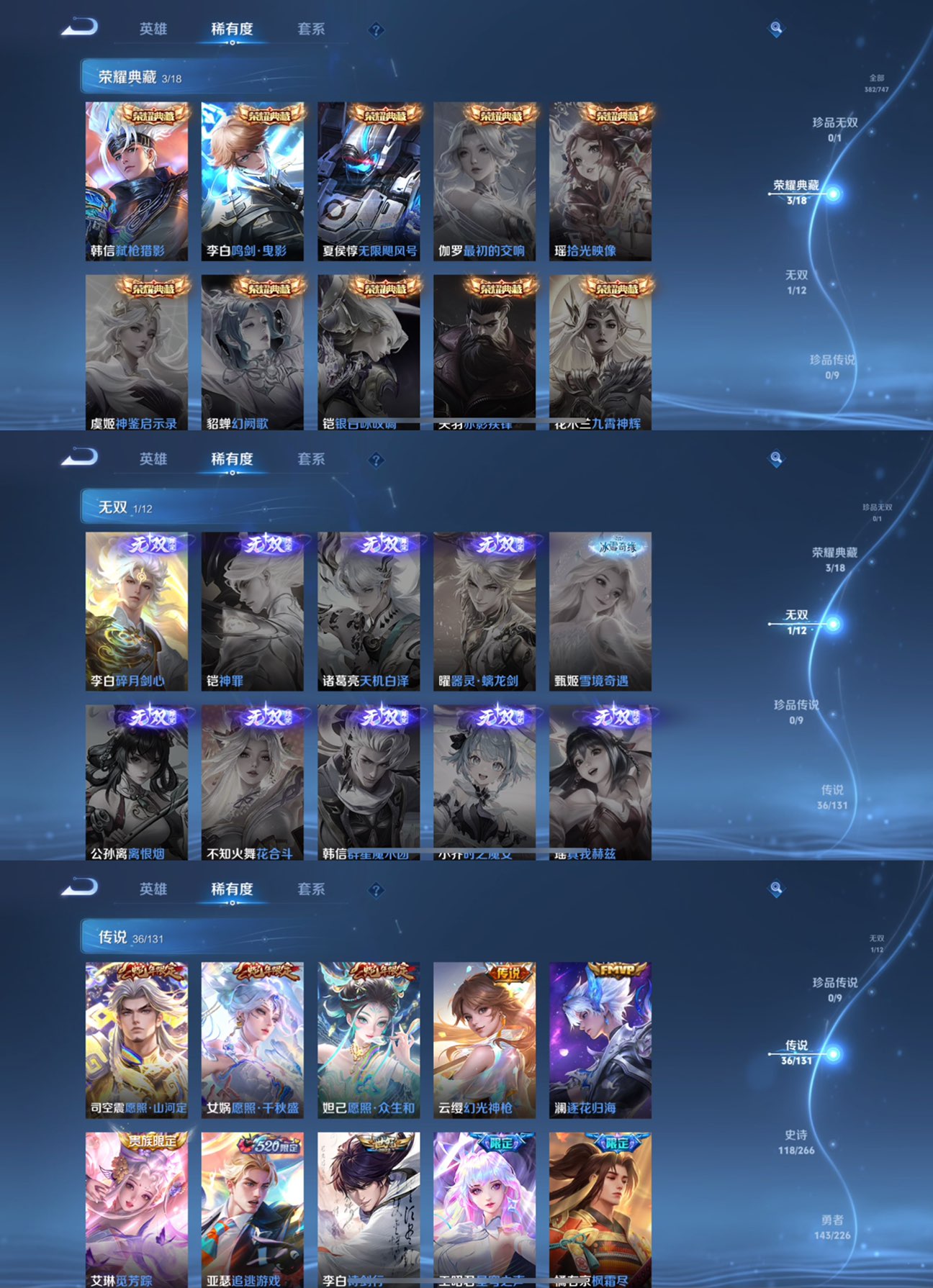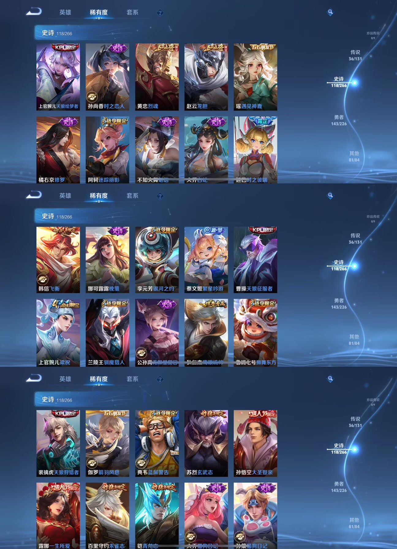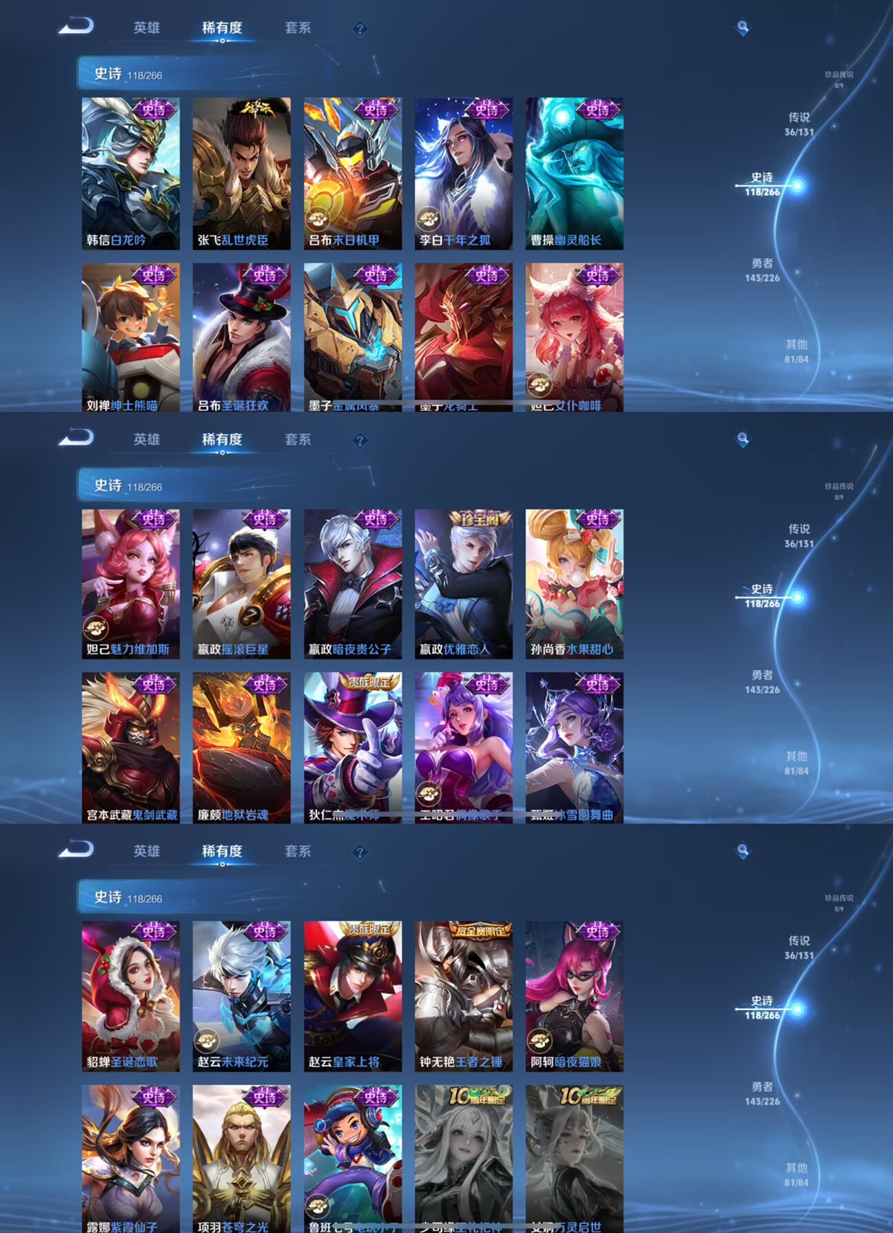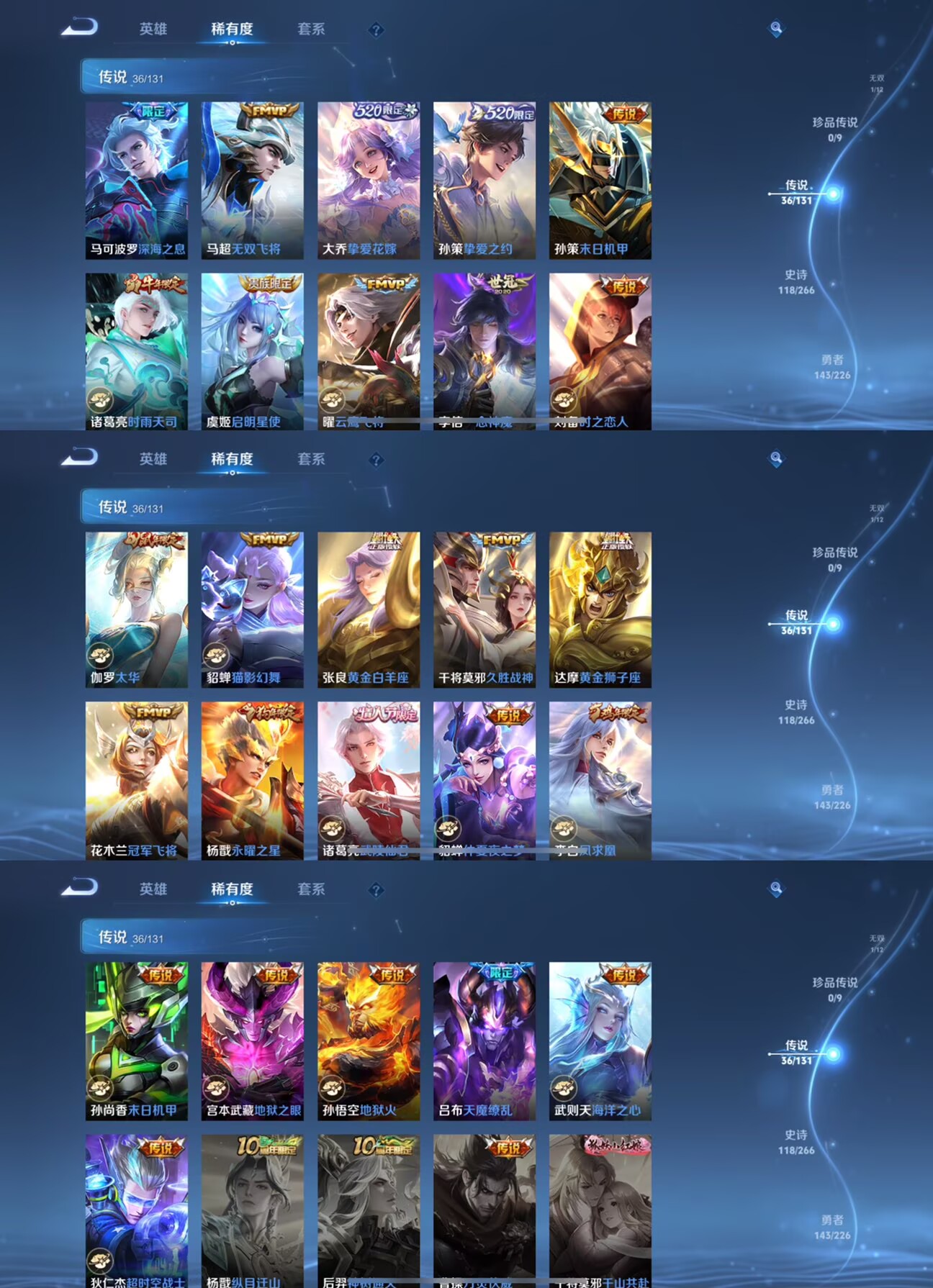 【传说皮肤】 追逃游戏 逐花归海 幻光神枪 愿照·山河定 愿照·千秋盛 愿照·众生和 觅芳踪 诗剑行 星穹之声 枫霜尽 深海之息 无双飞将 挚爱花嫁 挚爱之约 黄金狮子座 超时空战士 仲夏夜之梦 猫影幻舞 太华 久胜战神 地狱之眼 冠军飞将 凤求凰 一念神魔 时之恋人 天魔缭乱 末日机甲 末日机甲 地狱火 海洋之心 永曜