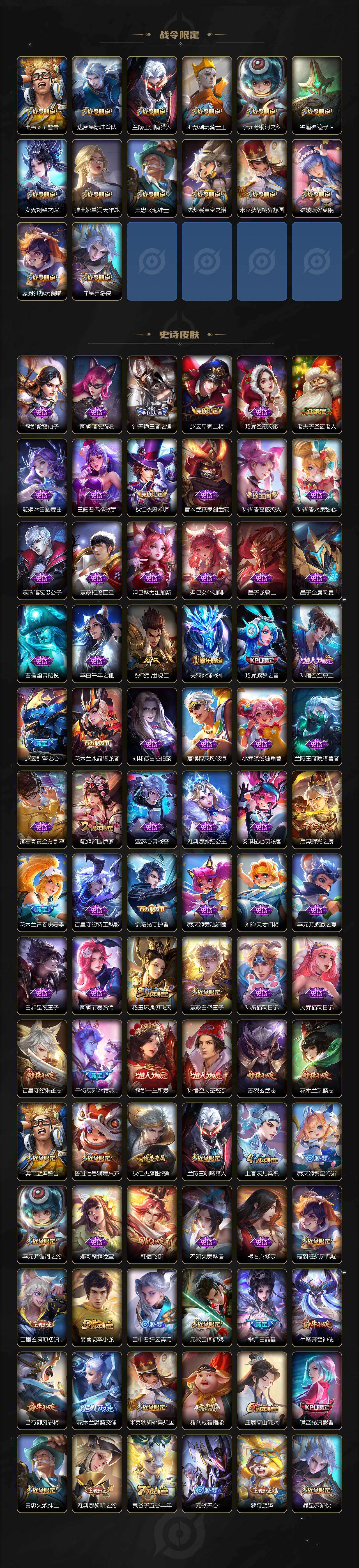 【史诗皮肤】 逐梦之音 冰霜恋舞曲 冰锋战神 飞衡 辉光之辰 青春决赛季 瑞麟志 默契交锋 圣诞老人 一生所爱 御风骁将 白晶晶 涂山容容 奔雷神
