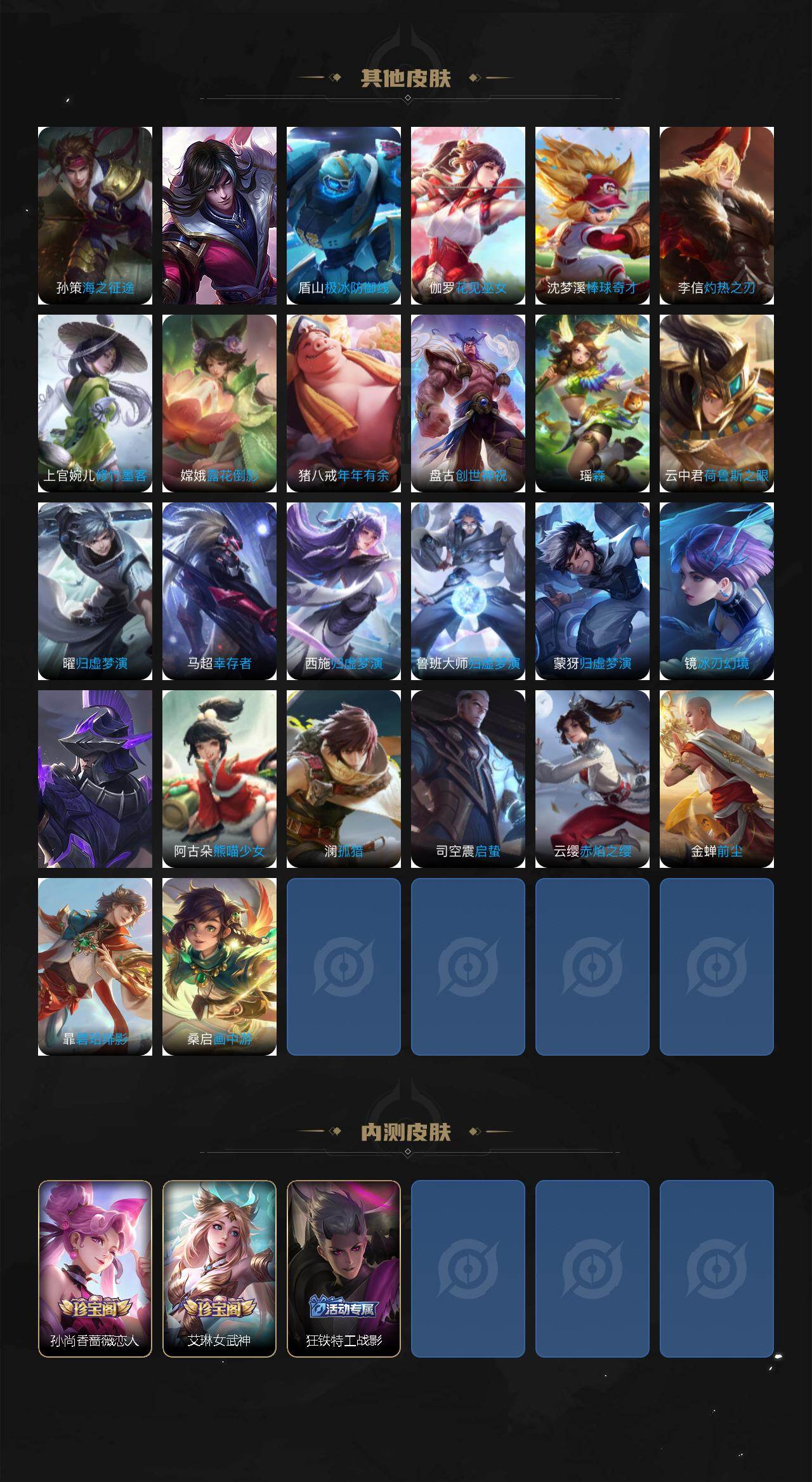 【传说皮肤】 燃星之曲 鸣野蒿 觅芳踪 山海·炽霜斩 诗剑行 白虎志 黄金狮子座 猫影幻舞 太华 久胜战神 祈雪灵祝 炽阳神光 凤求凰 零号·赤焰 永曜之星 云鹰飞将 云霓雀翎 启明星使 时雨天司