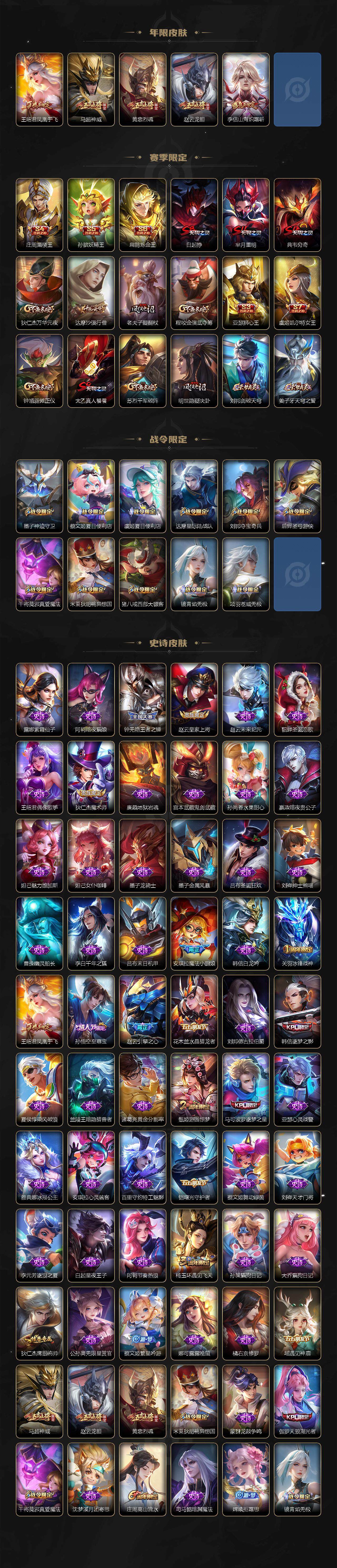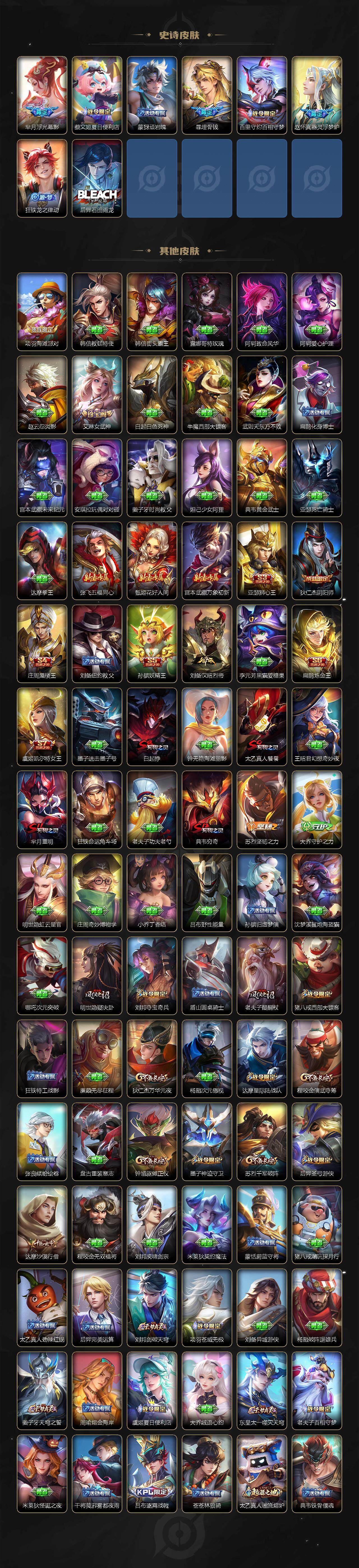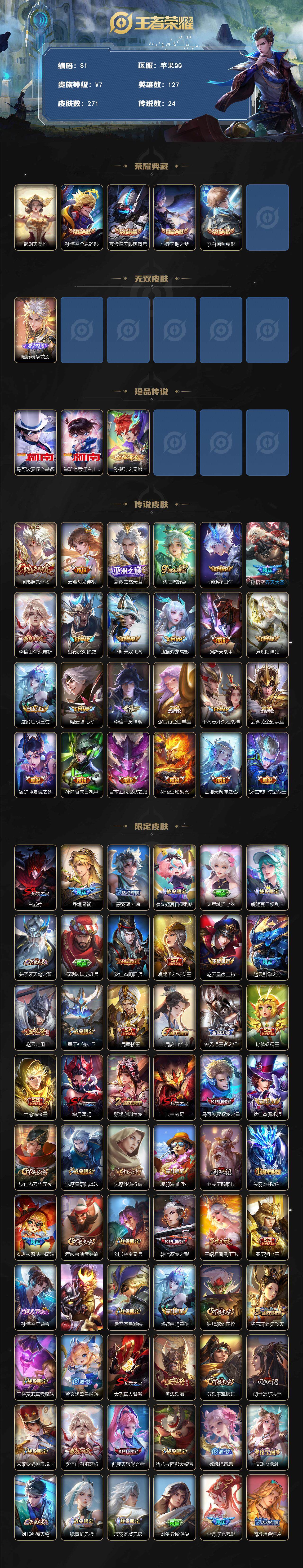 至尊星耀I-127英雄-271皮肤-1无双-4典藏-3珍品传说-24传说-74史诗