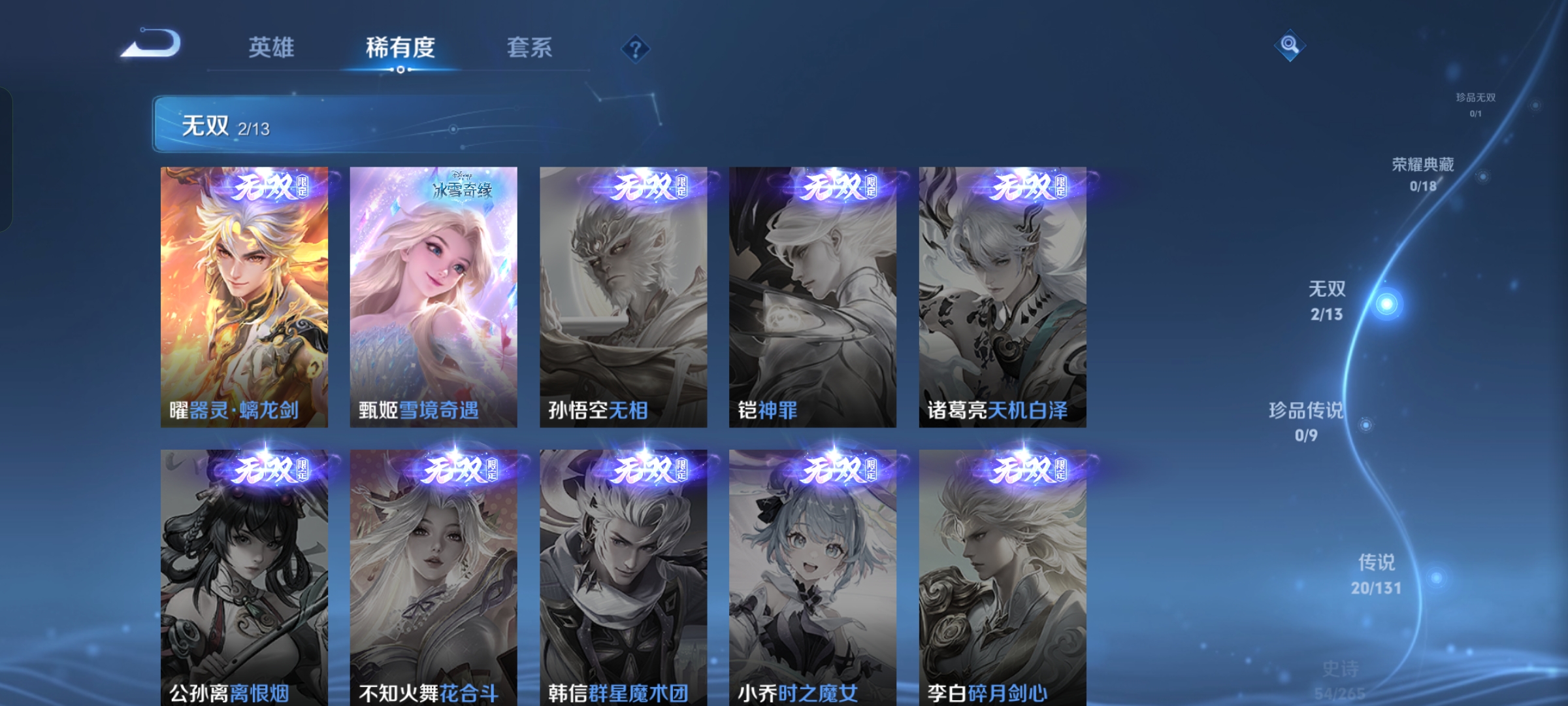 【传说皮肤】 千劫归真 浮生妄 祥瑞亨通 愿照·九州拓 愿照·众生和 愿照·岁时盈 山海·炽霜斩 绯月行 仲夏夜之梦 猫影幻舞 久胜战神 地狱之眼 黄金射手座 冠军飞将 胖达荣荣 乞巧织情 海洋之心 启明星使 淬星耀世 时雨天司