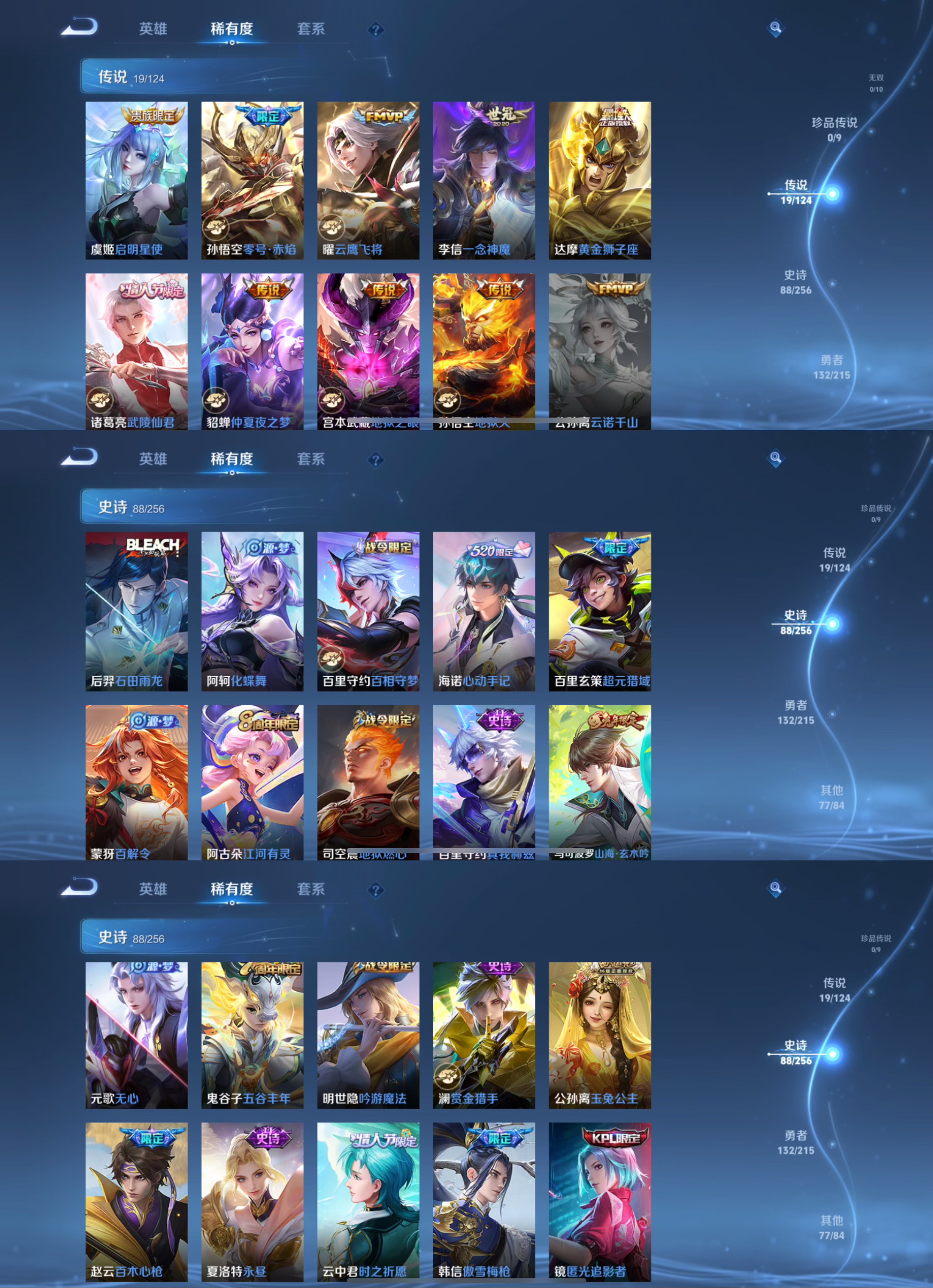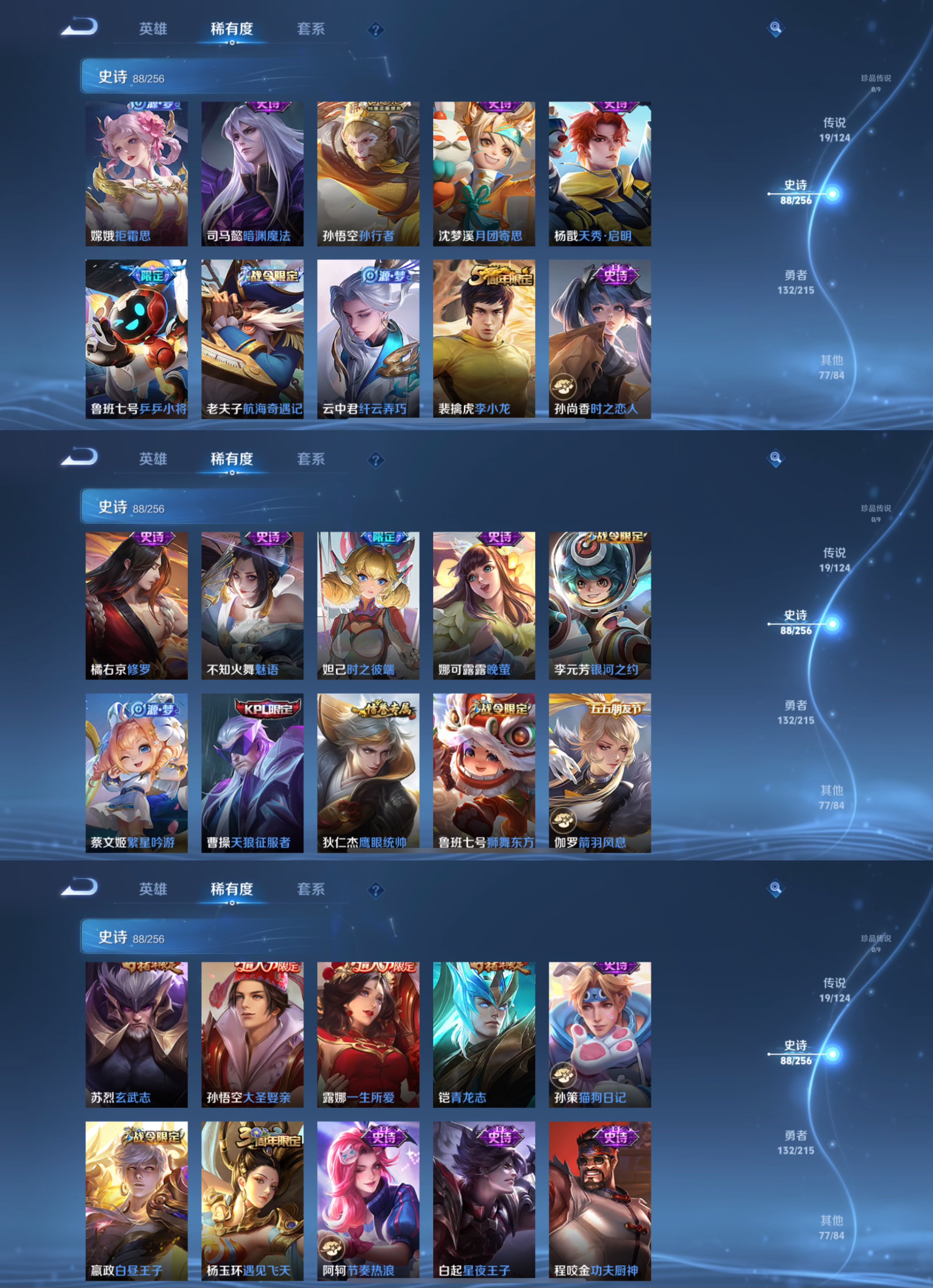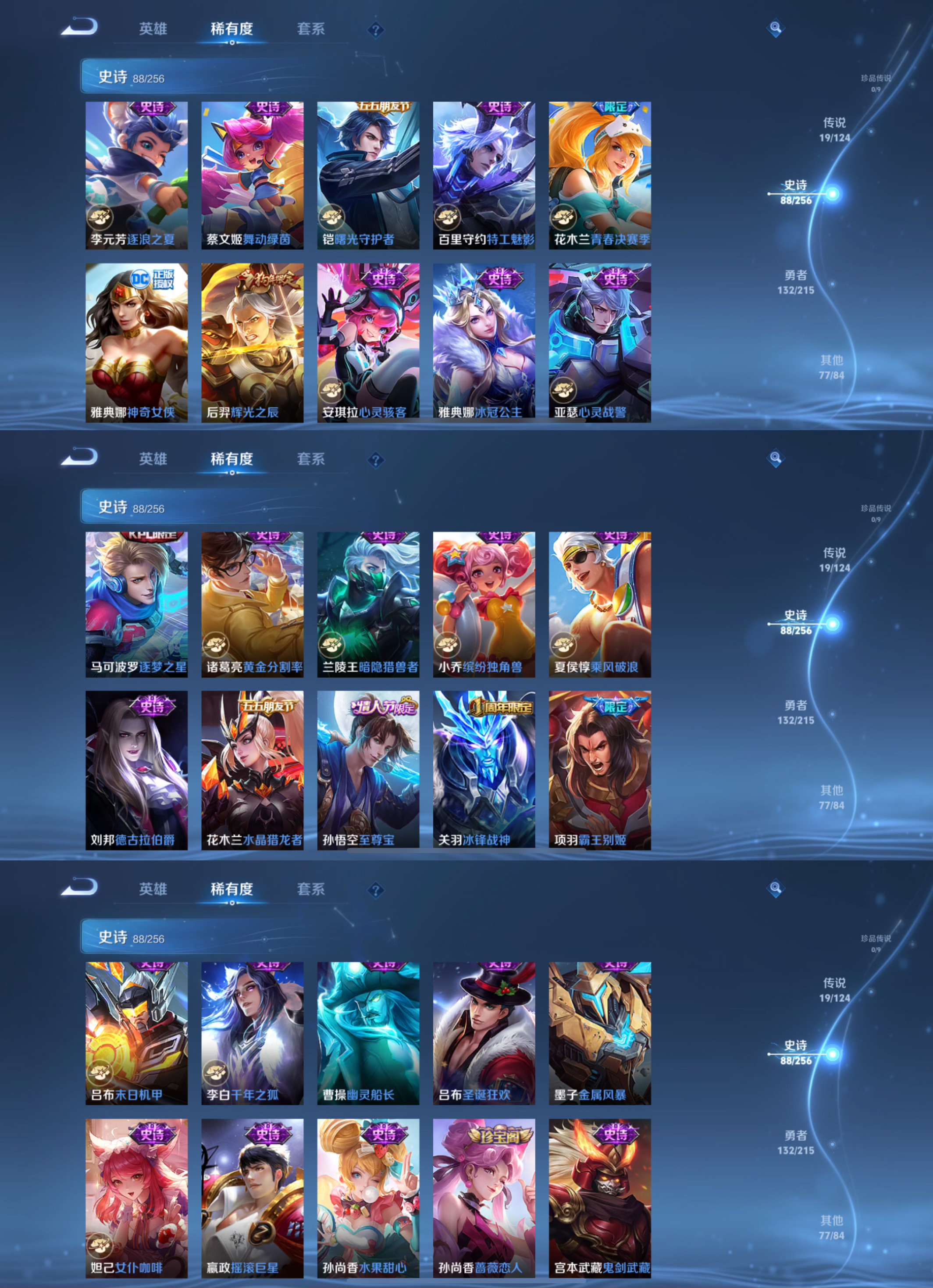 【史诗皮肤】 天狼征服者 时之彼端 百相守梦 冰锋战神 傲雪梅枪 辉光之辰 青春决赛季 逐霄战戟 敬我三分 青龙志 超元猎域 一生所爱 电玩小子 乒乒小将 青龙志 玄武志 逐