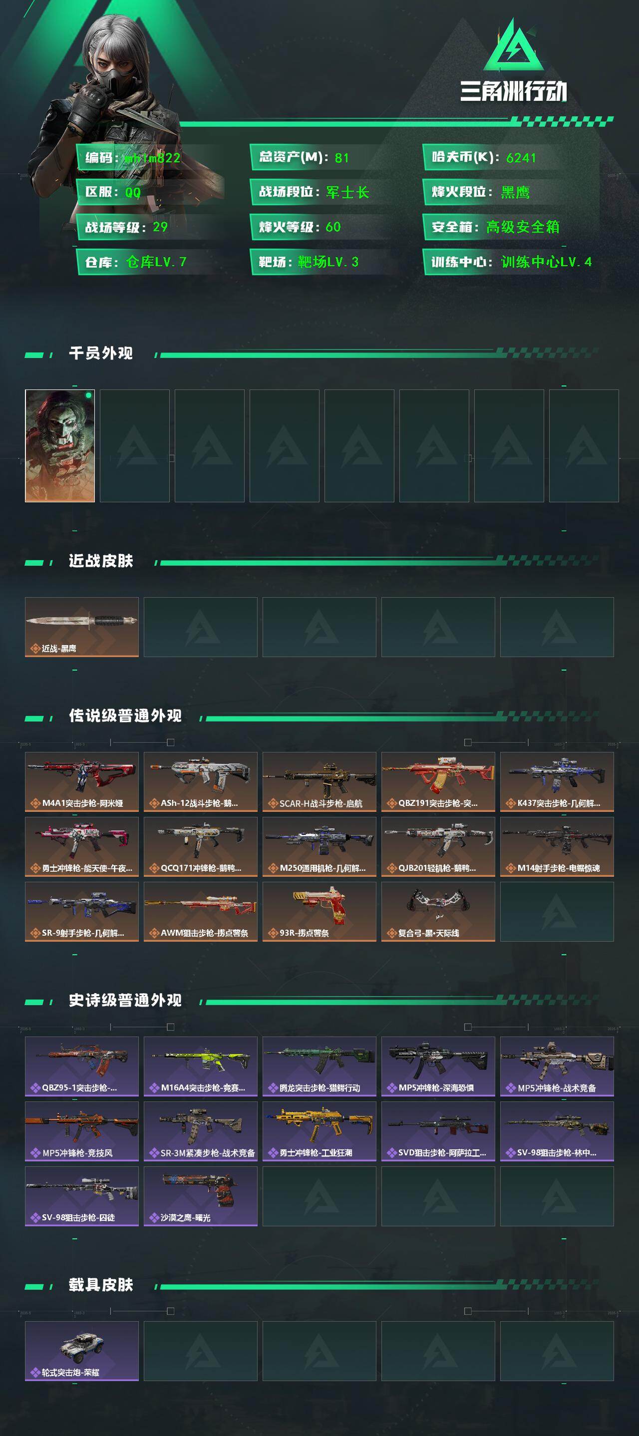 【mhlm822】81m总资产-6241k哈伏币-60烽火等级-黑鹰-29战场