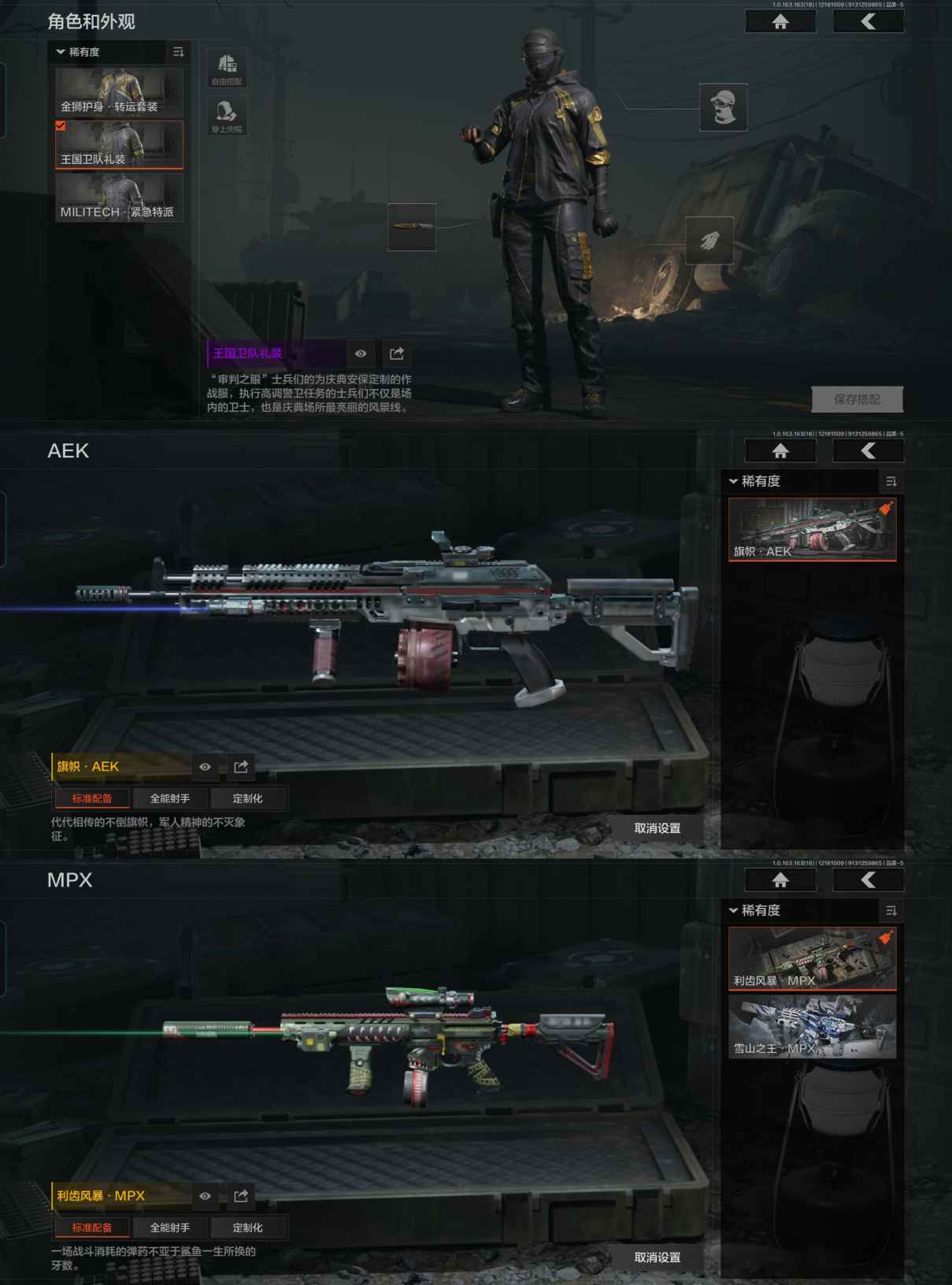 DSTW1781安卓Q-等级30-仓库价值1.5m-科恩币188k-【套装】 金狮护身·转运套装 王国卫队礼装 MILITECH·紧急特派 【枪皮】 旗帜·AEK 利齿风暴·MPX 【近战武器】 热能武器补牢 赢家匕首